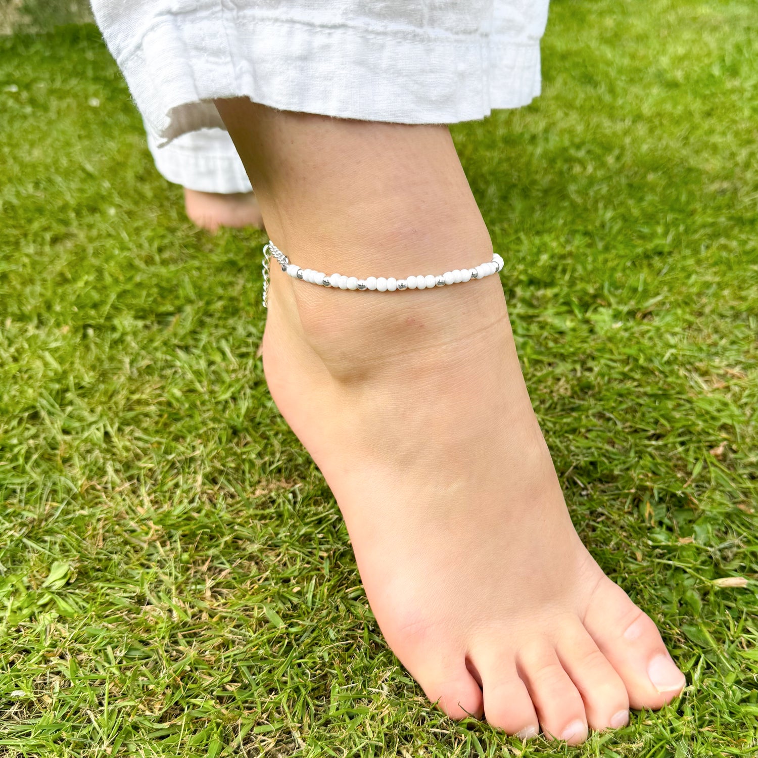 Plus Size White Glass Bead Anklet with Silver Plated Beads
