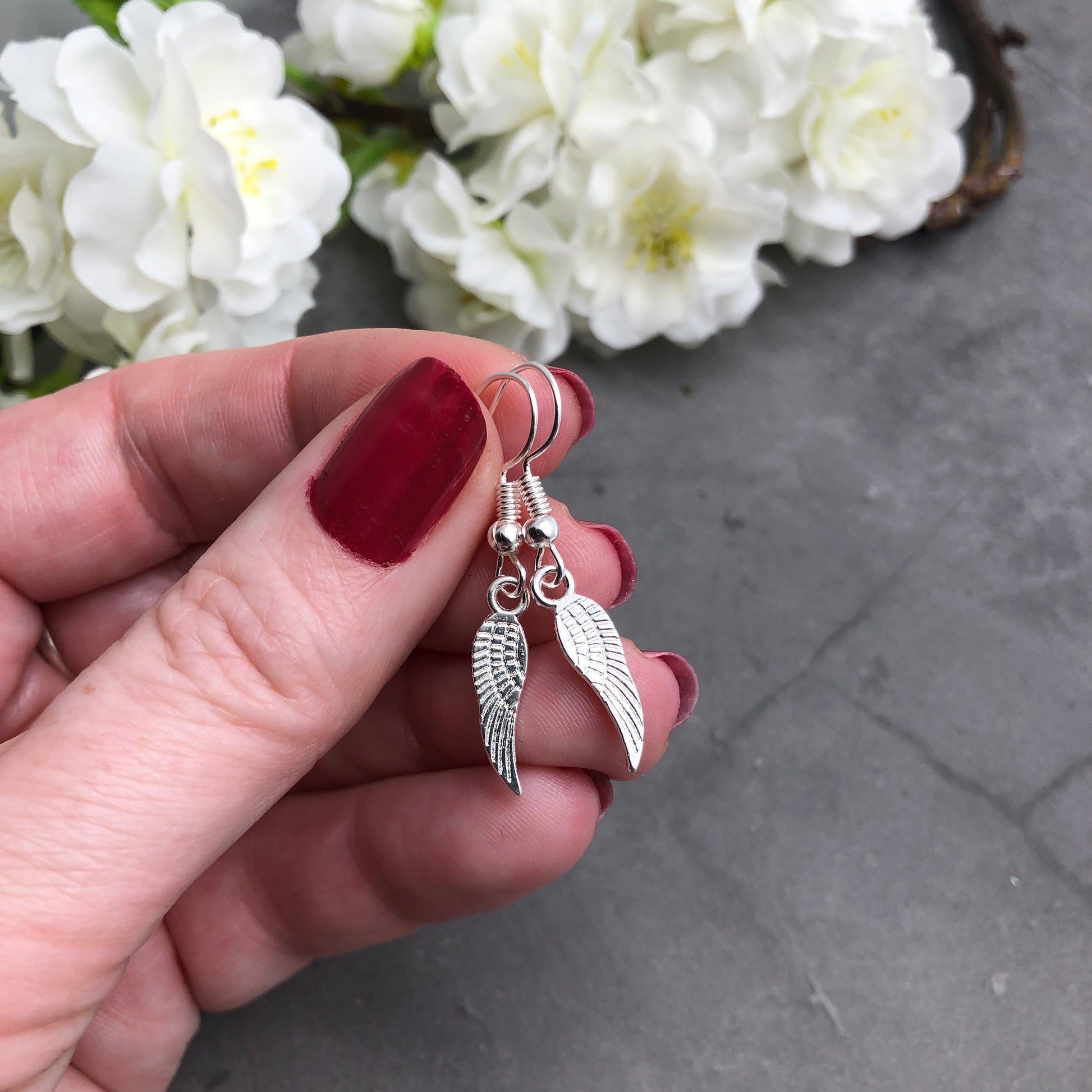 Very dainty earrings with silver tone angel wings charms.