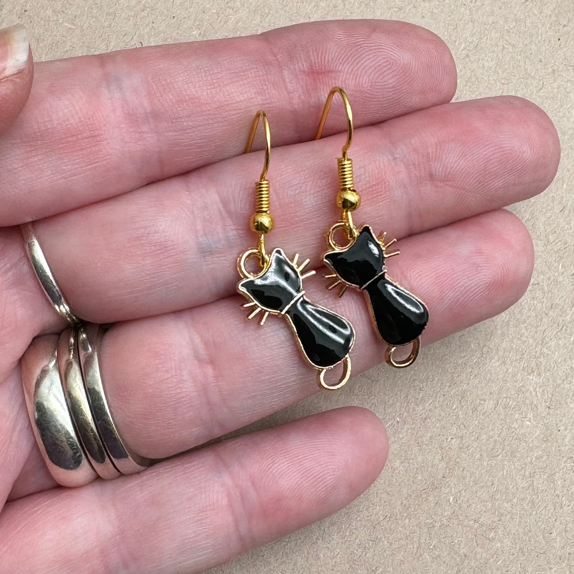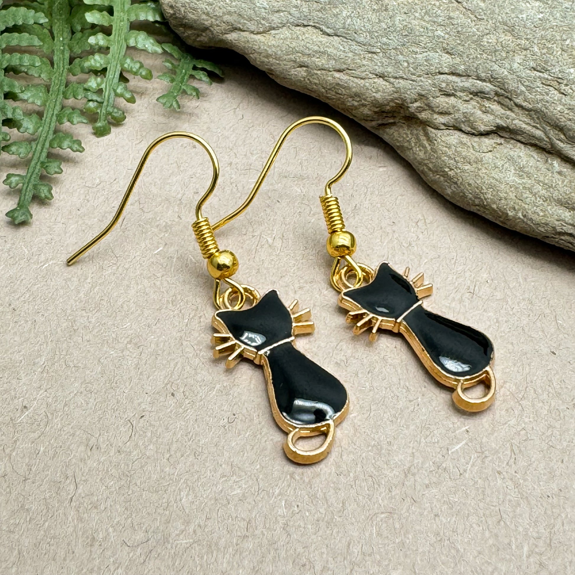 Super cute earrings featuring black enamel kitty cat charm beads, mounted on gold tone hooks.