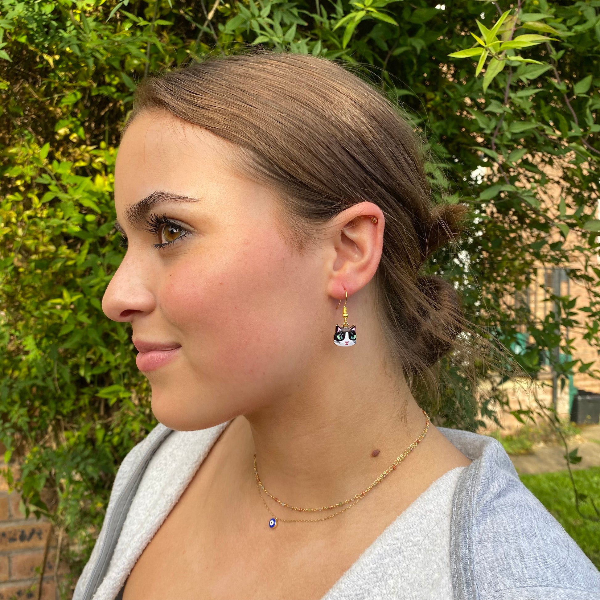 These super cute charm bead earrings feature tuxedo cat enamel charms on gold tone hooks. Gorgeous and fun look that gets people talking!