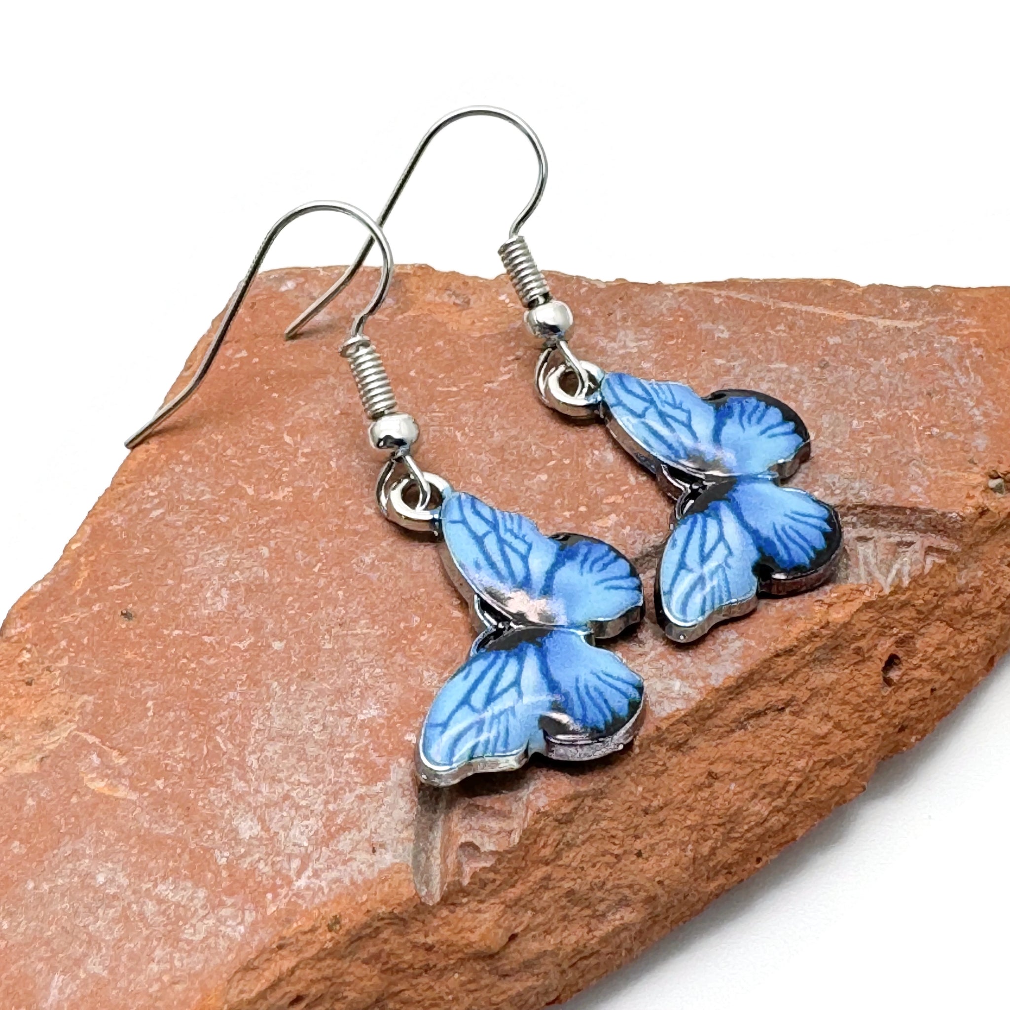 - Pretty butterfly charm beads in blue enamel and silver tone alloy, mounted on nickel free antique silver tone hooks.