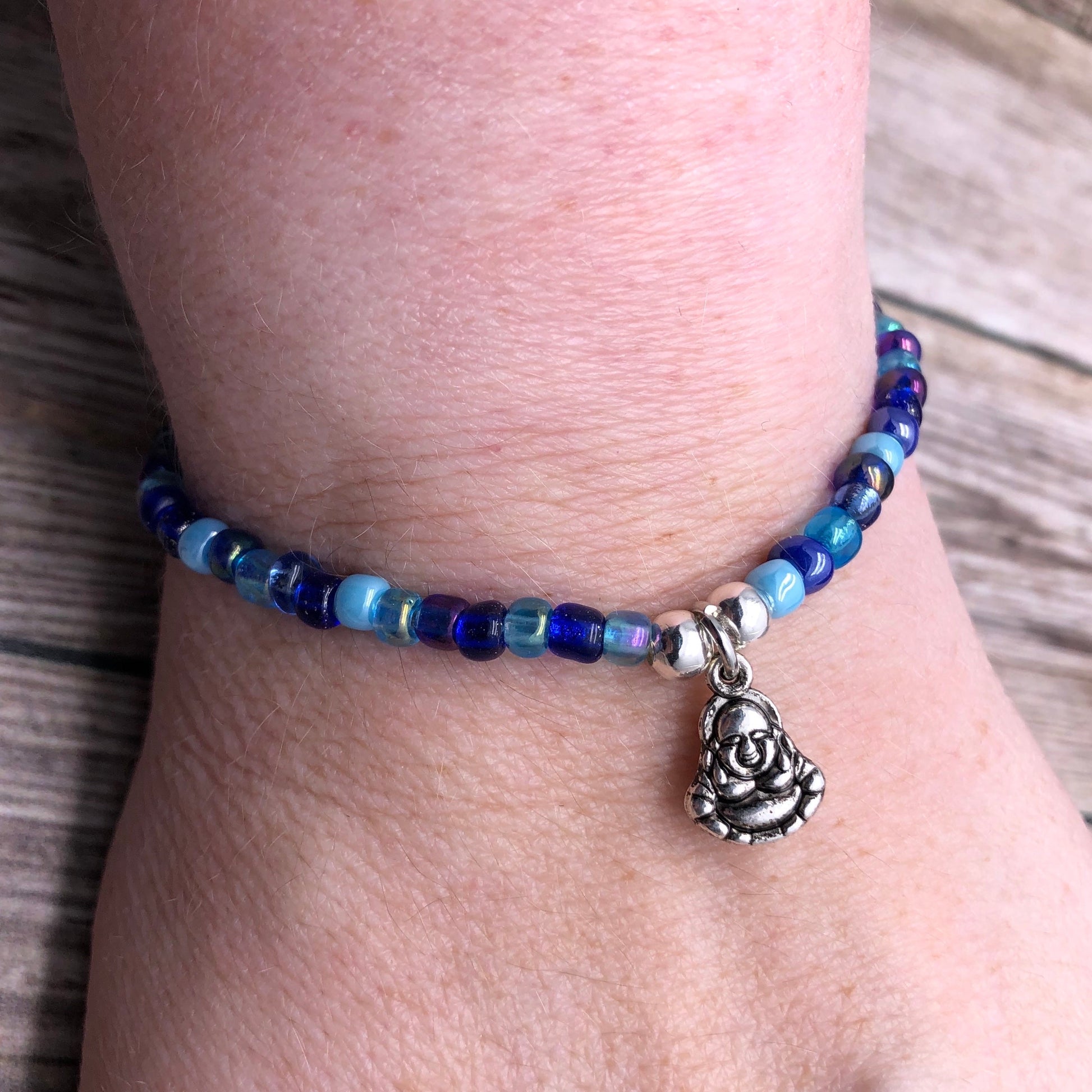 Dainty and delicate little charm bracelet with a cute silver tone Buddha charm and 4mm glass seed beads, on strong elastic thread. Perfect thoughtful little gift!