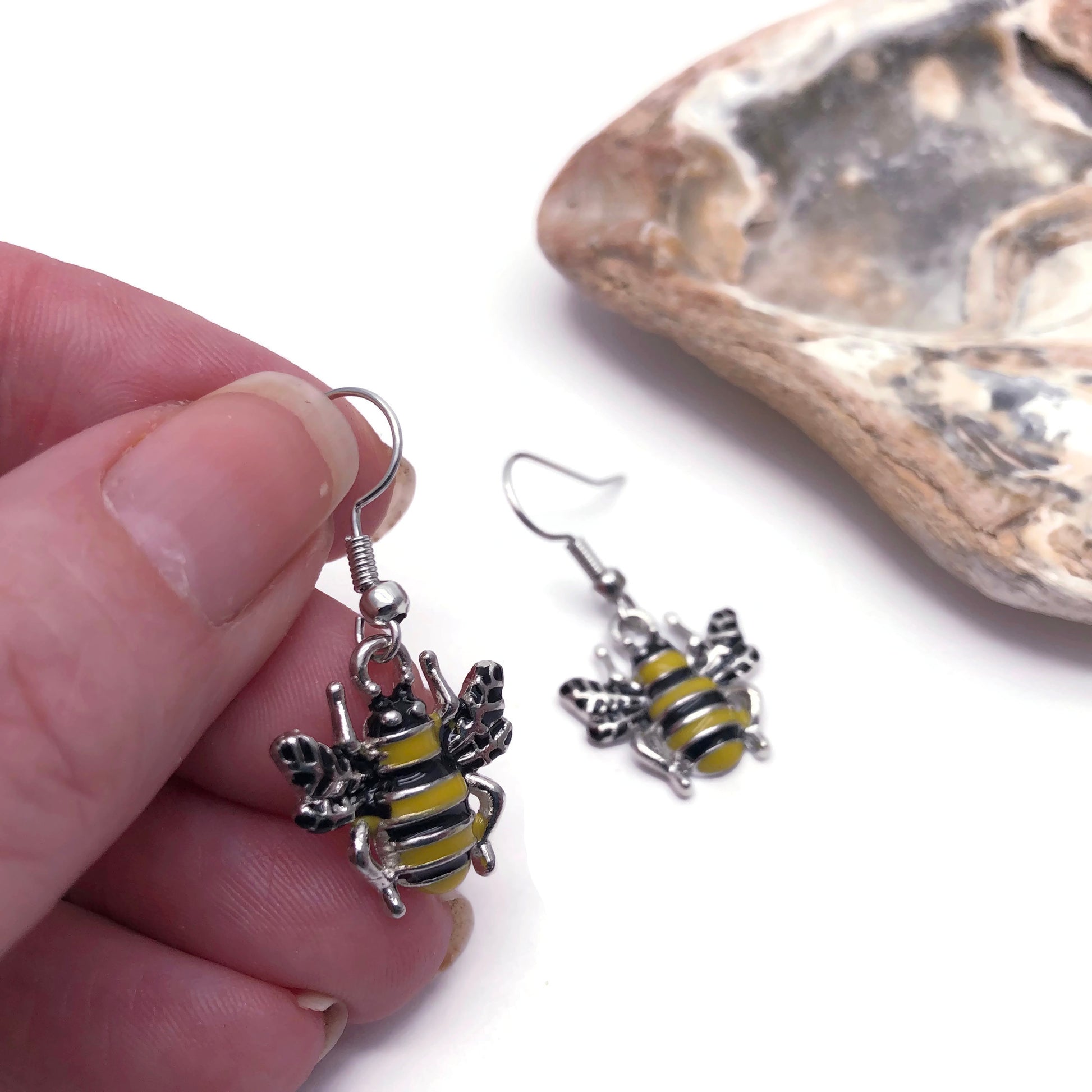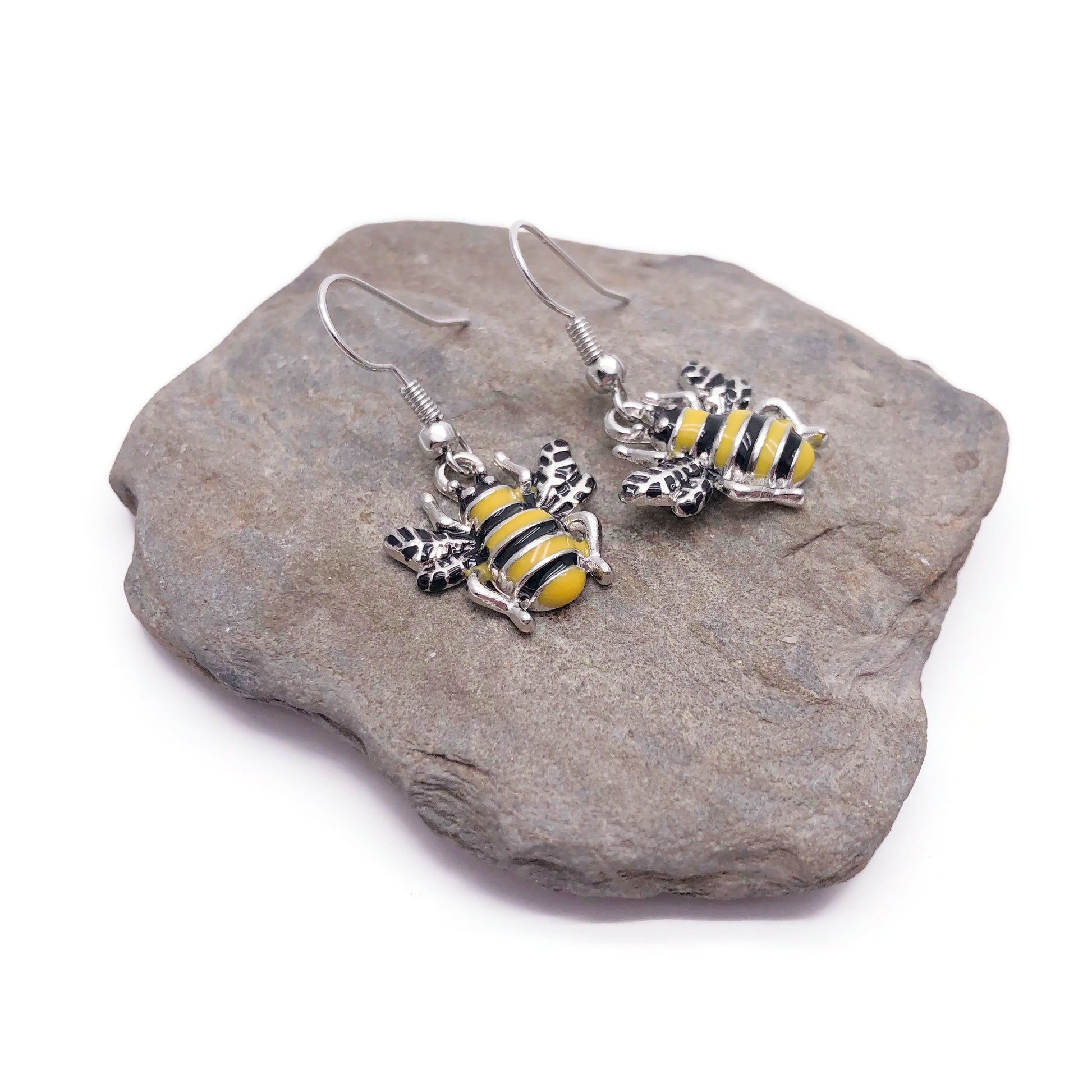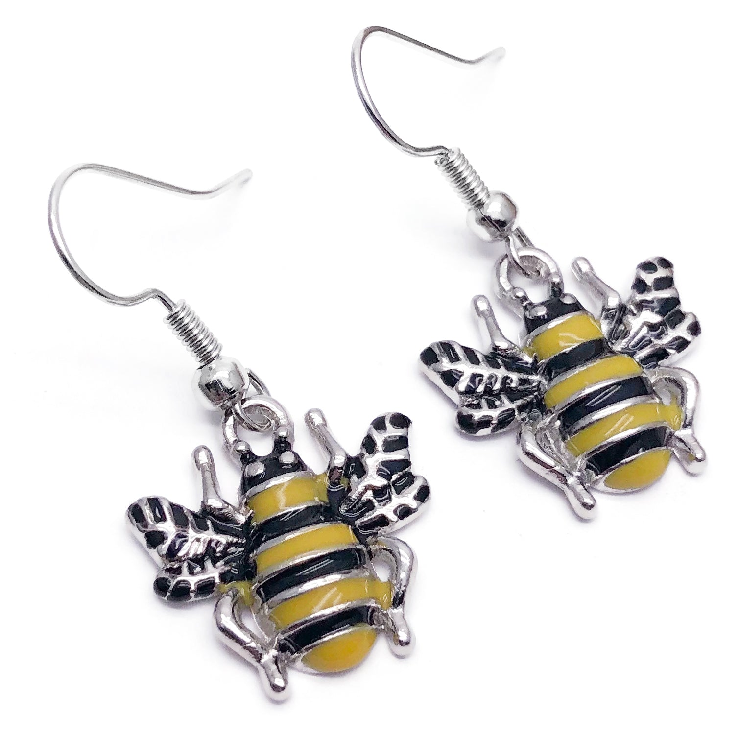 These super cute earrings feature detailed bumble bee enamel charms in black and yellow, on silver tone hooks. A gorgeous fun look that gets people talking, and a perfect stocking filler for bee lovers!
