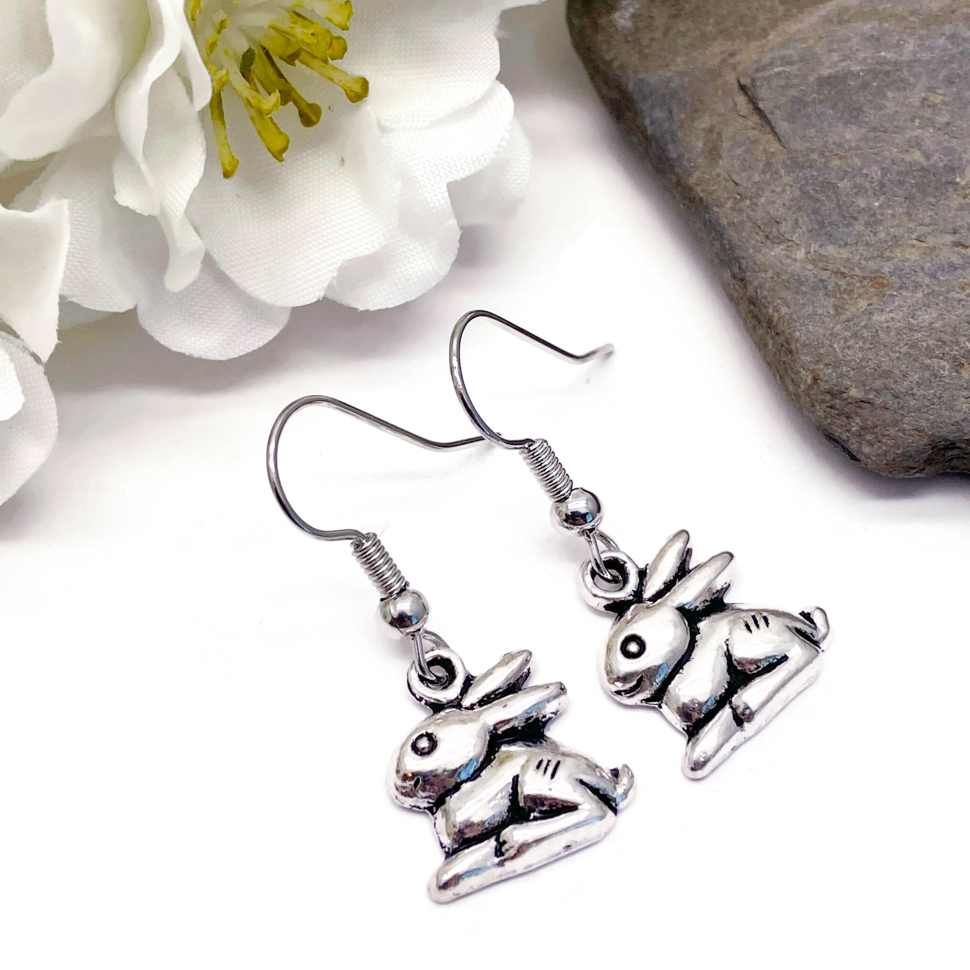 Cute little earrings in the shape of bunny rabbits, with detailed silver tone alloy charms.