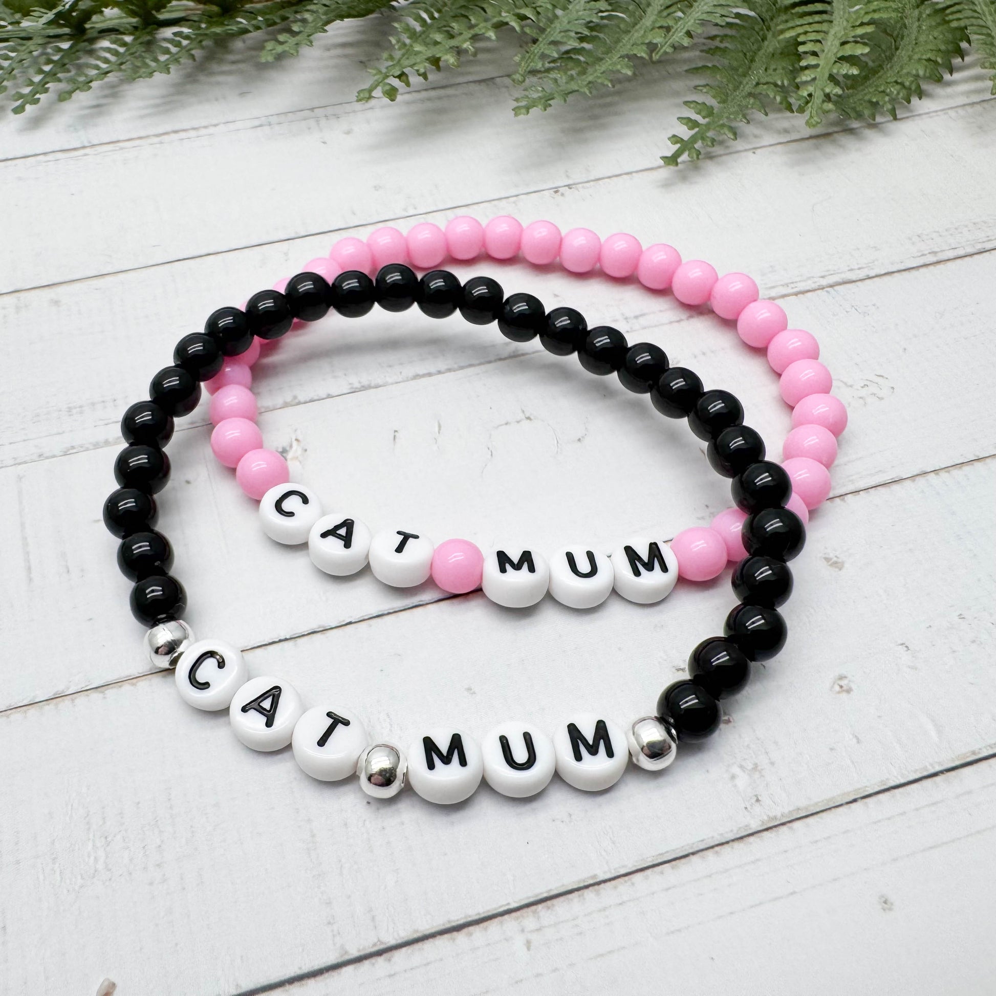 This Cat Mum message bracelet is made with 6mm acrylic beads and flat white acrylic letter beads measuring 7mm in diameter. The bracelet is threaded on strong elastic, allowing a small amount of stretch so it can be rolled gently onto the wrist. Lightweight, allergy-friendly, and comfortable, it is suitable for all-day wear.