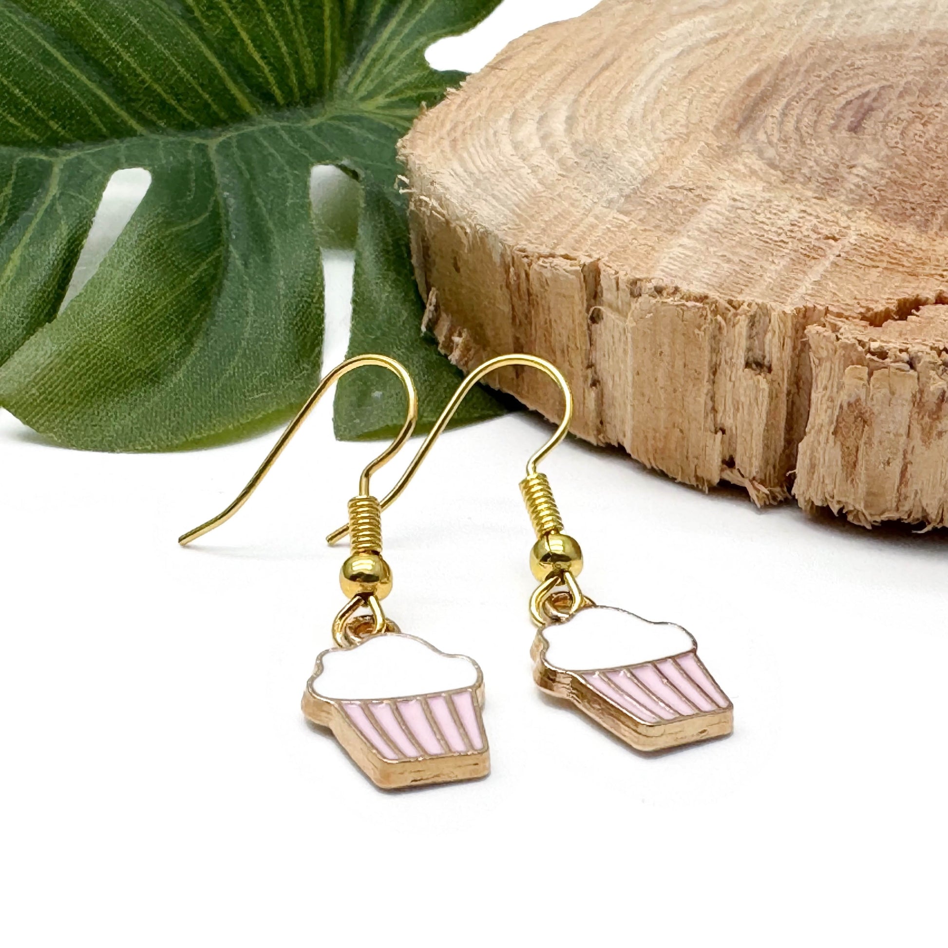 Cupcake Charm Earrings, Pink and White Cake Enamel Charm Beads