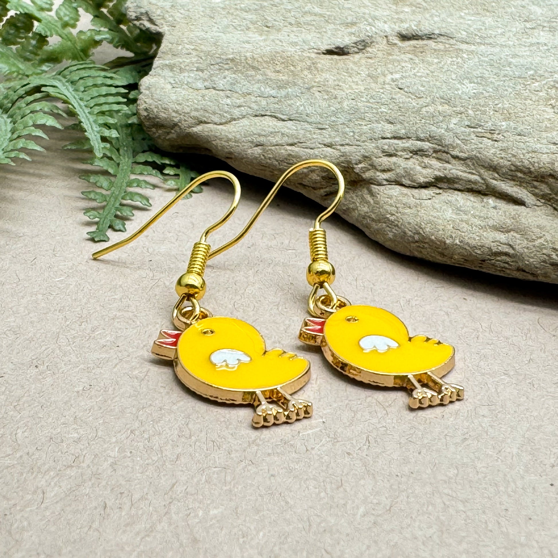 - Super cute chicken charm beads in yellow enamel and gold tone alloy. The earrings look great on and gives you that little extra 'cheep'!