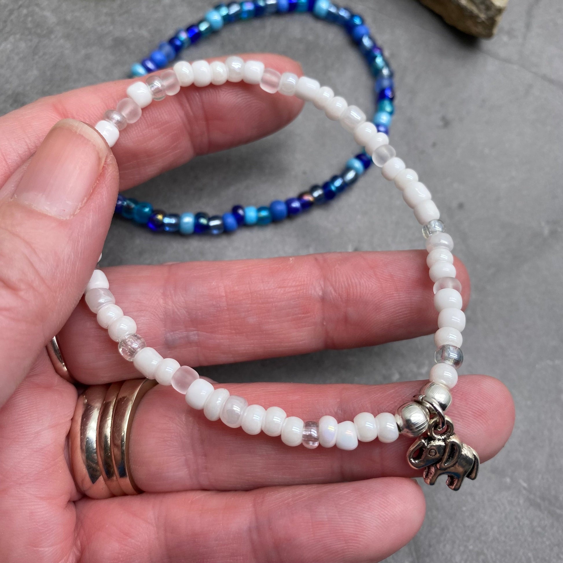 Dainty and delicate little charm bracelet with a cute silver tone elephant charm and 4mm glass seed beads, on strong elastic thread. Perfect thoughtful little gift for the animal lover!