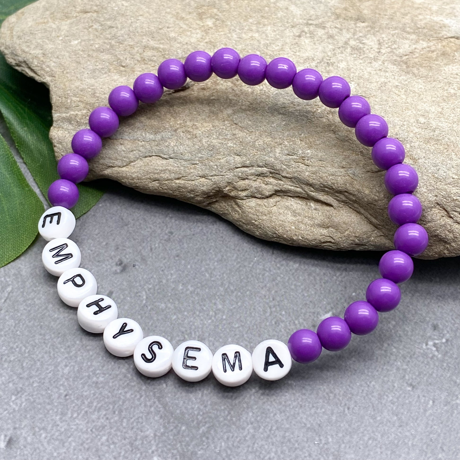 This emphysema medical alert bracelet is made with 6mm acrylic beads and flat white acrylic letter beads measuring 7mm in diameter. The bracelet is threaded on strong elastic, allowing a small amount of stretch so it can be rolled gently onto the wrist. Lightweight, allergy-friendly, and comfortable, it is suitable for all-day wear.