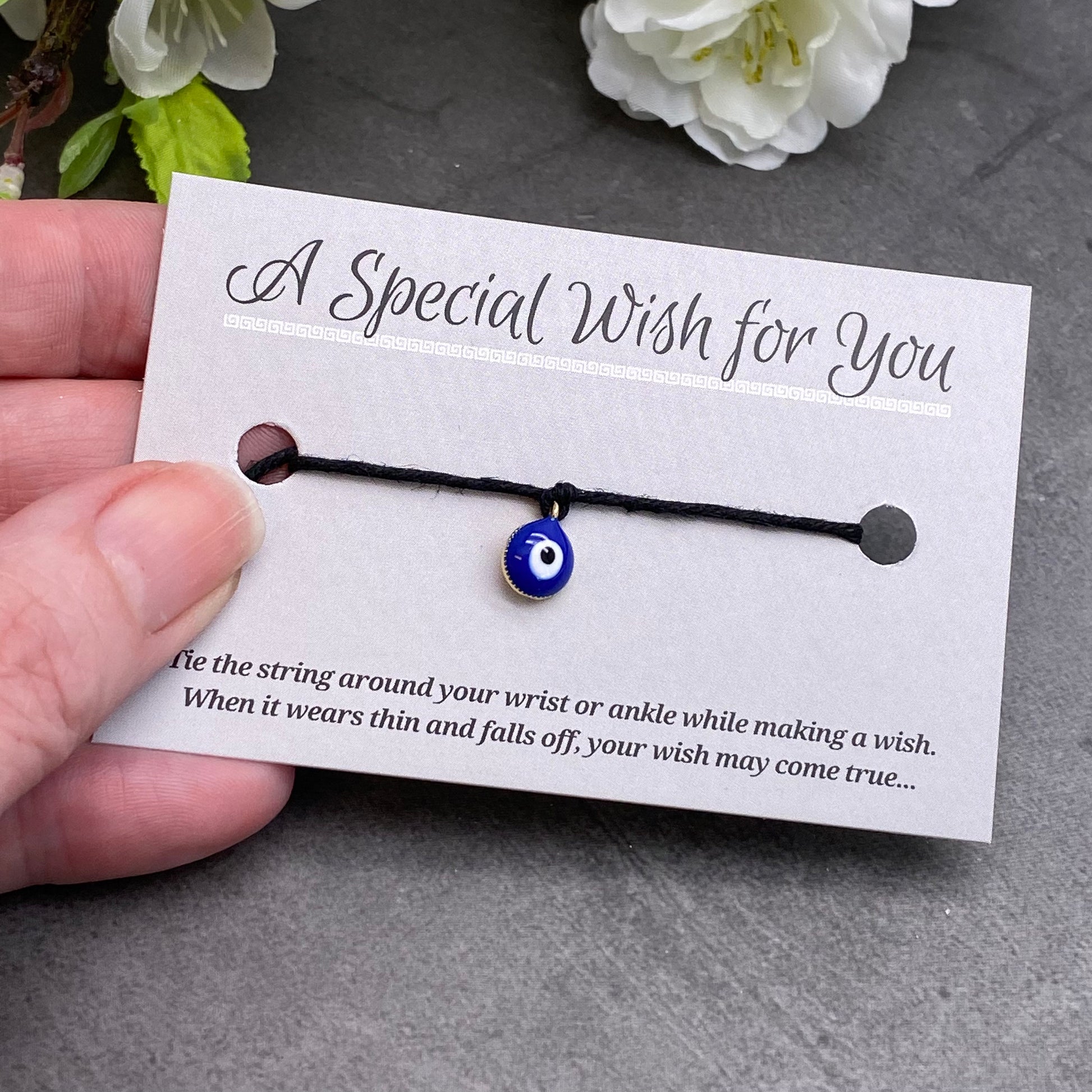 Tie the string to your wrist or ankle while making a special wish. When bracelet wears thin and falls off, your wish may come true...