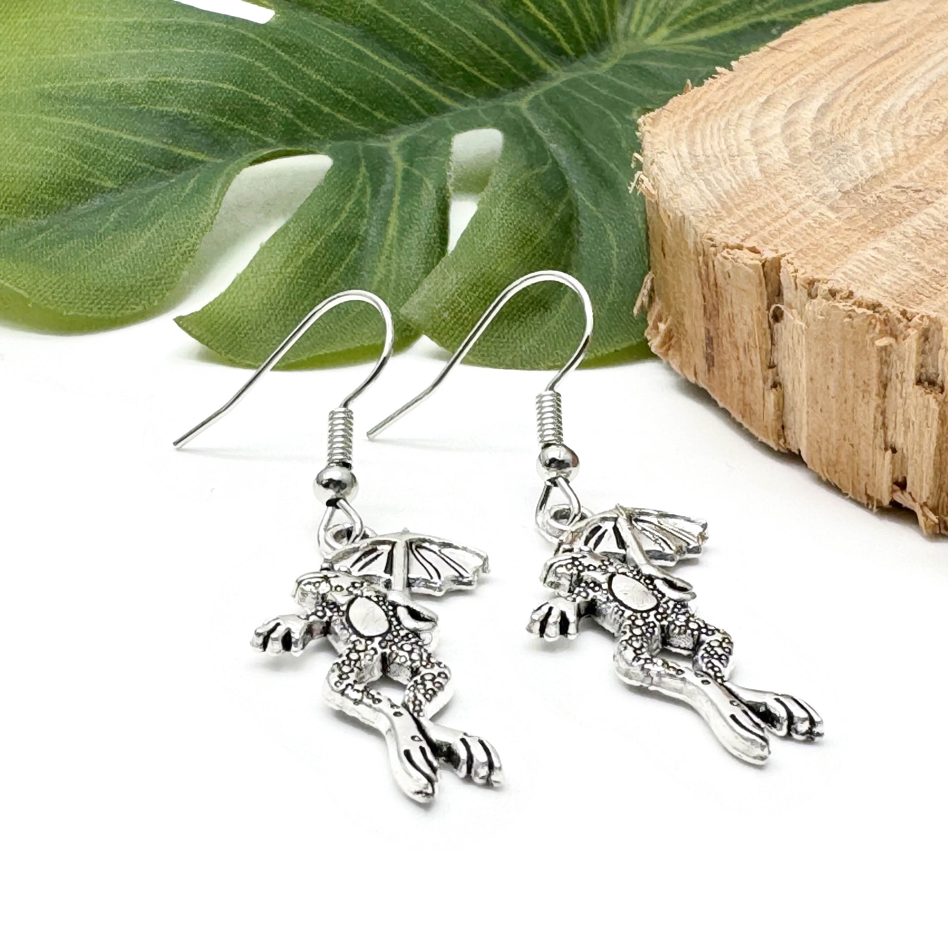 Frog Earrings, Tibetan Silver Tone Toad with Umbrella Charms