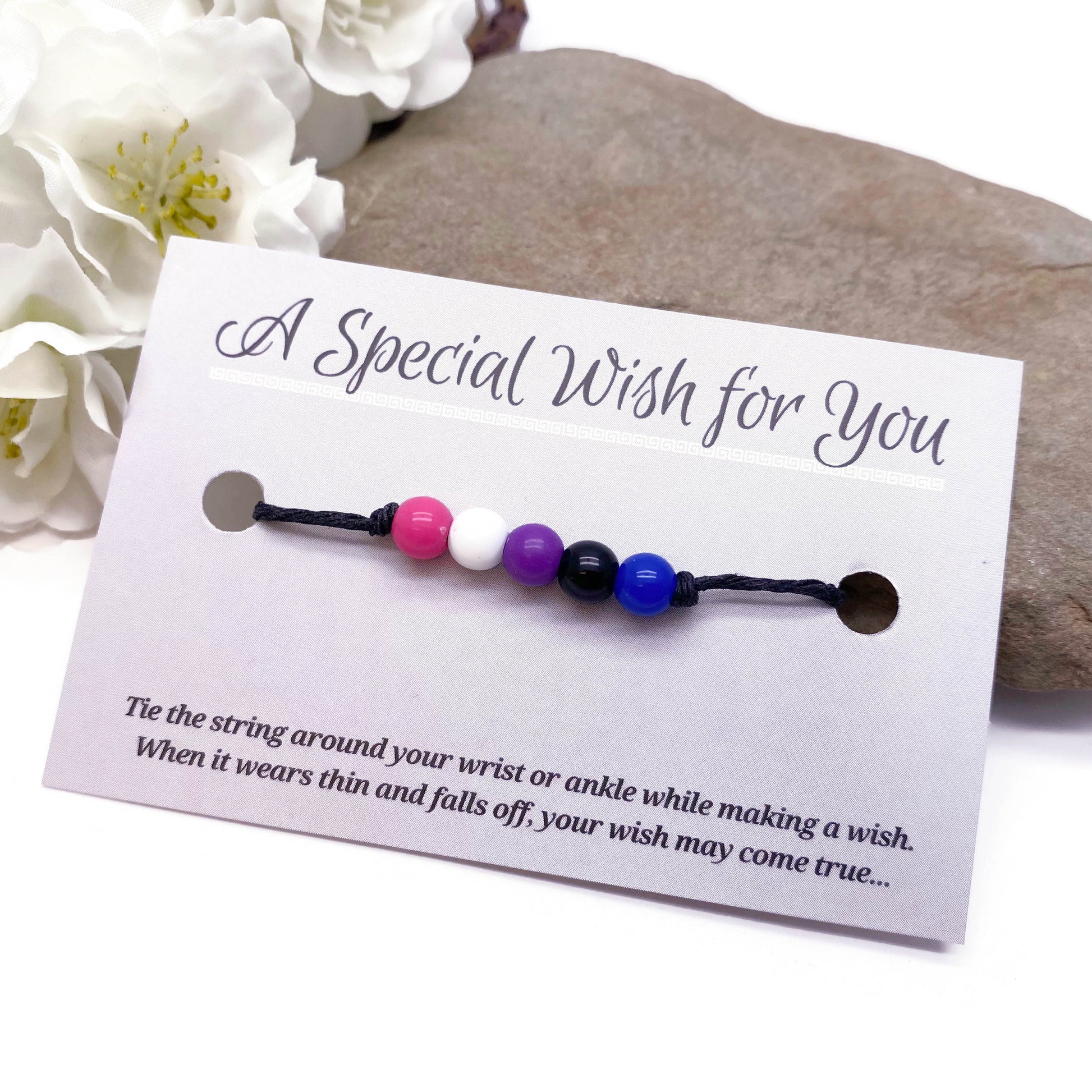 The slim black hemp string bracelet has colourful 6mm acrylic beads in a pink, white, purple, black and royal blue pattern. The bracelet is presented on a printed card (business card sized), and thus ready to give away. All our items also come with a pretty organza bag for easy gift giving.