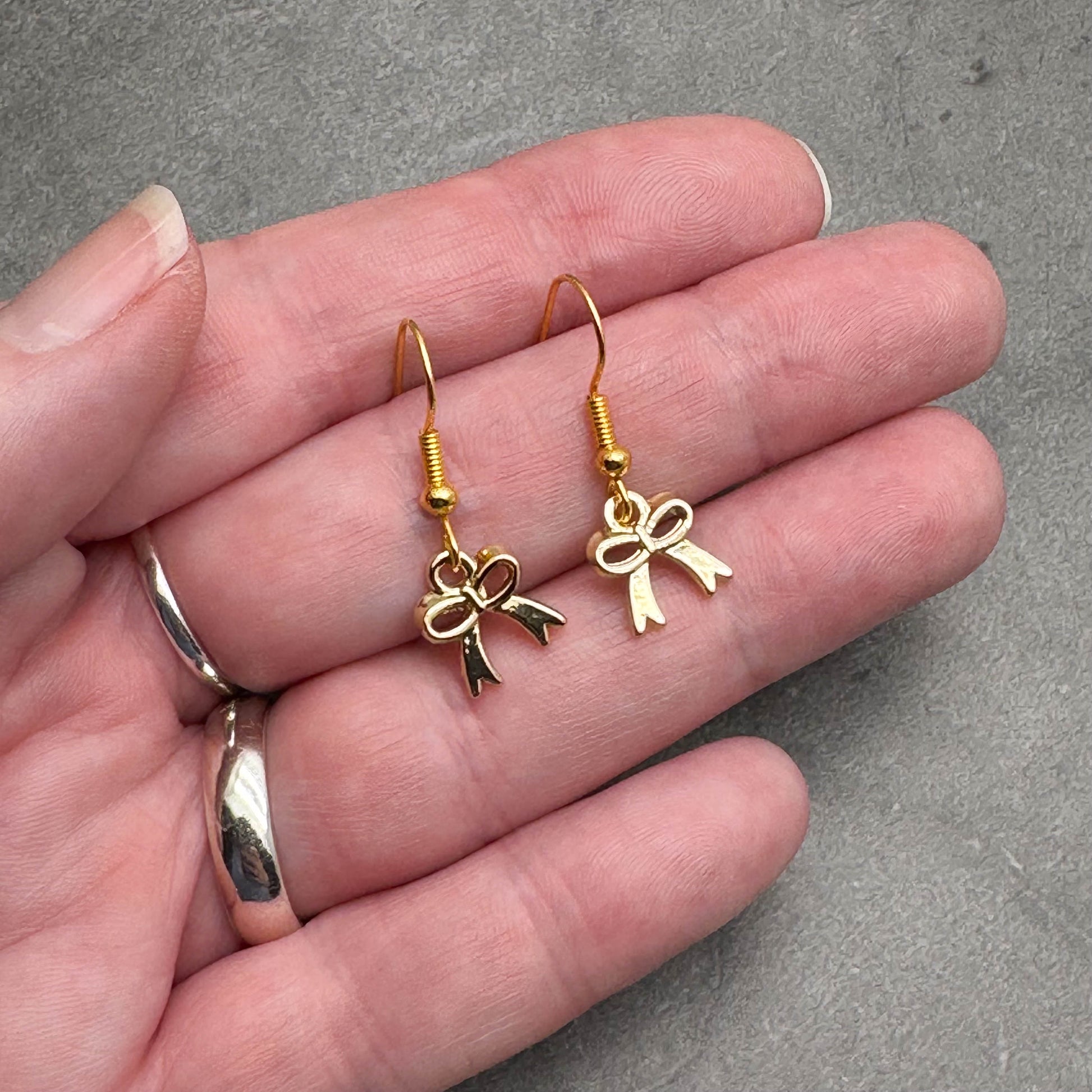 These super cute charm bead earrings feature delicate little bow charms, mounted on nickel free gold tone hooks. Gorgeous, trendy and fun look that gets people talking!