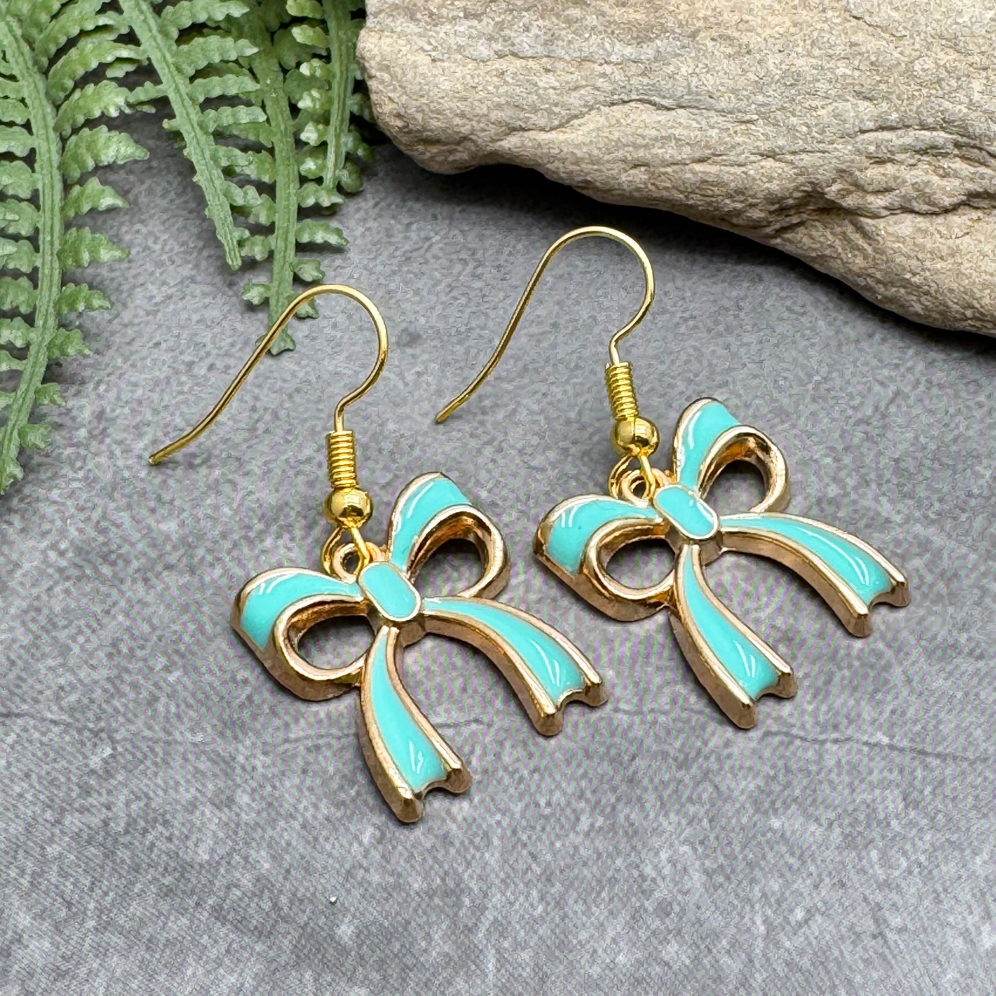 These super cute charm bead earrings feature pale green bow charms, mounted on nickel free gold tone hooks. Gorgeous, trendy and fun look that gets people talking!
