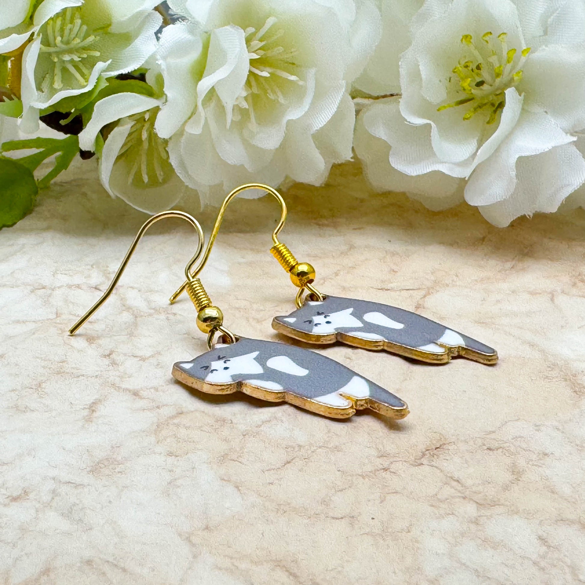 - Super cute earrings featuring grey and white dangling enamel kitty cat charm beads, mounted on gold tone hooks.