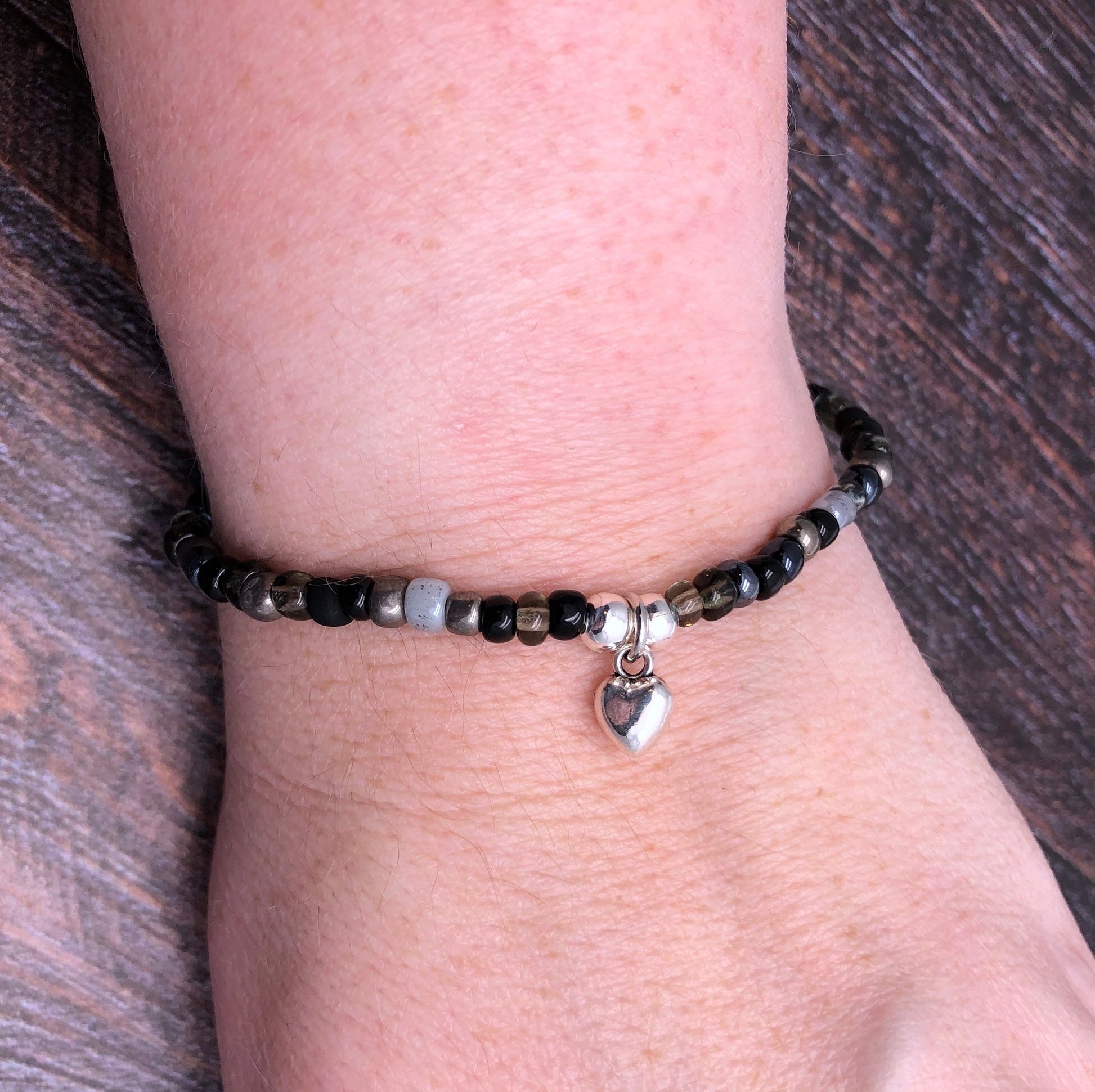 Dainty and delicate little charm bracelet with a cute silver tone heart charm and 4mm glass seed beads, on strong elastic thread. Perfect thoughtful little Valentine's Day gift!