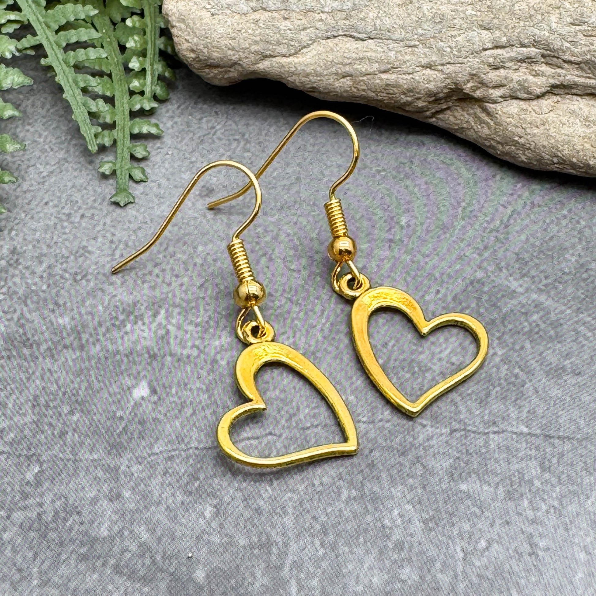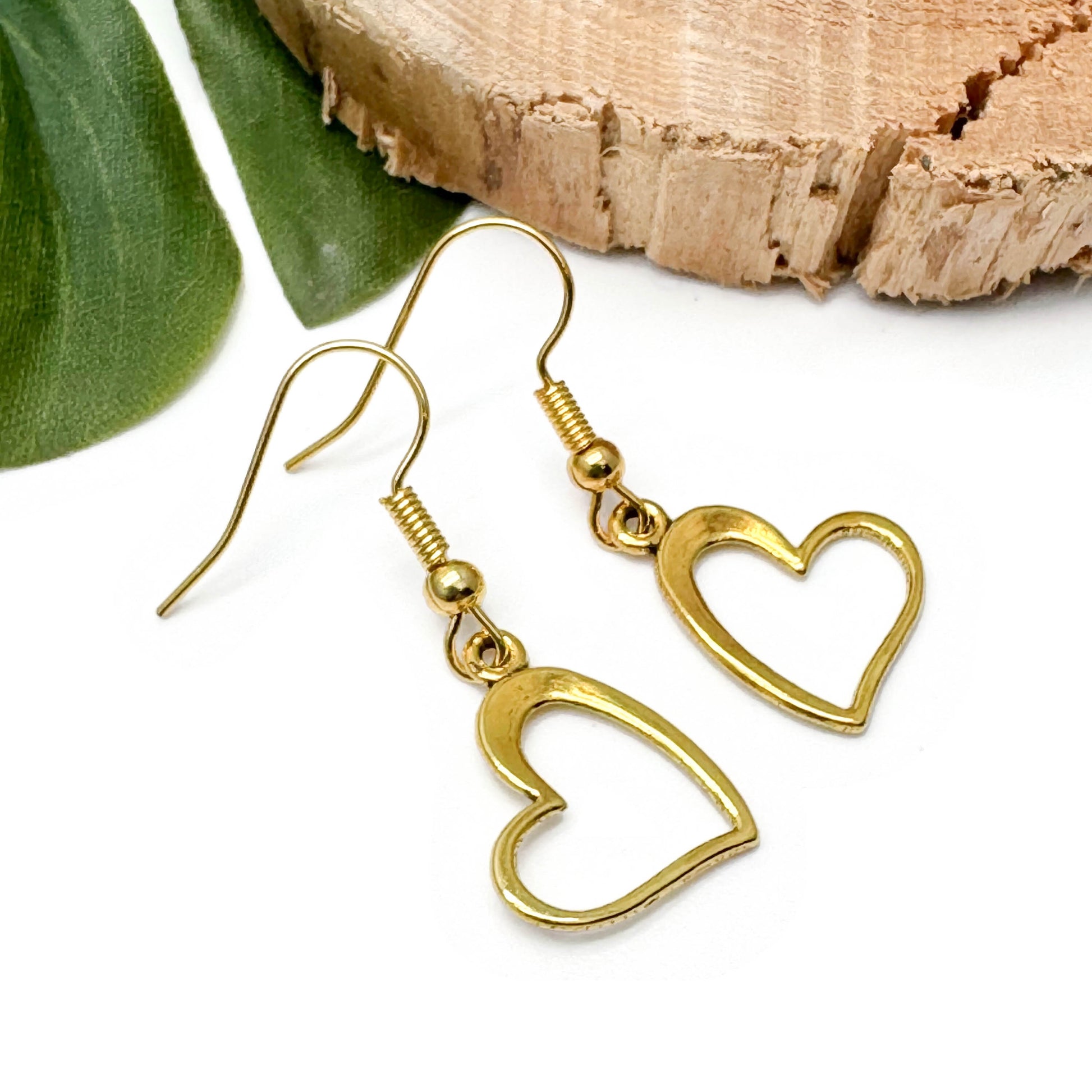 Hollow heart shaped gold plated charms, mounted on nickel free hooks. Very lightweight and comfortable to wear.