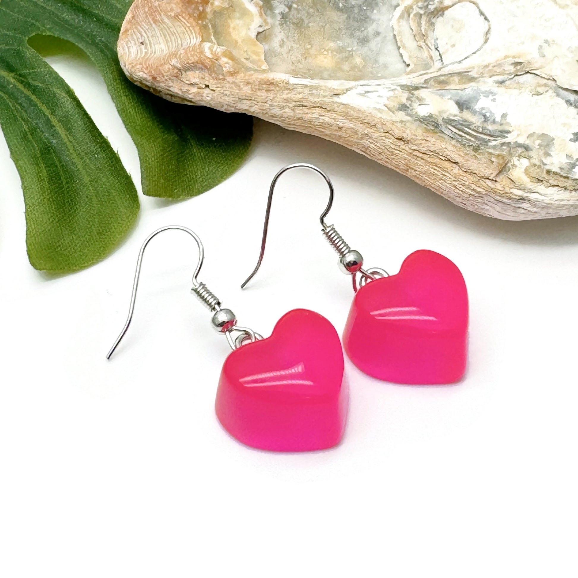 These super cute charm bead earrings feature a chubby resin heart bead in bright pink, on silver plated hooks.