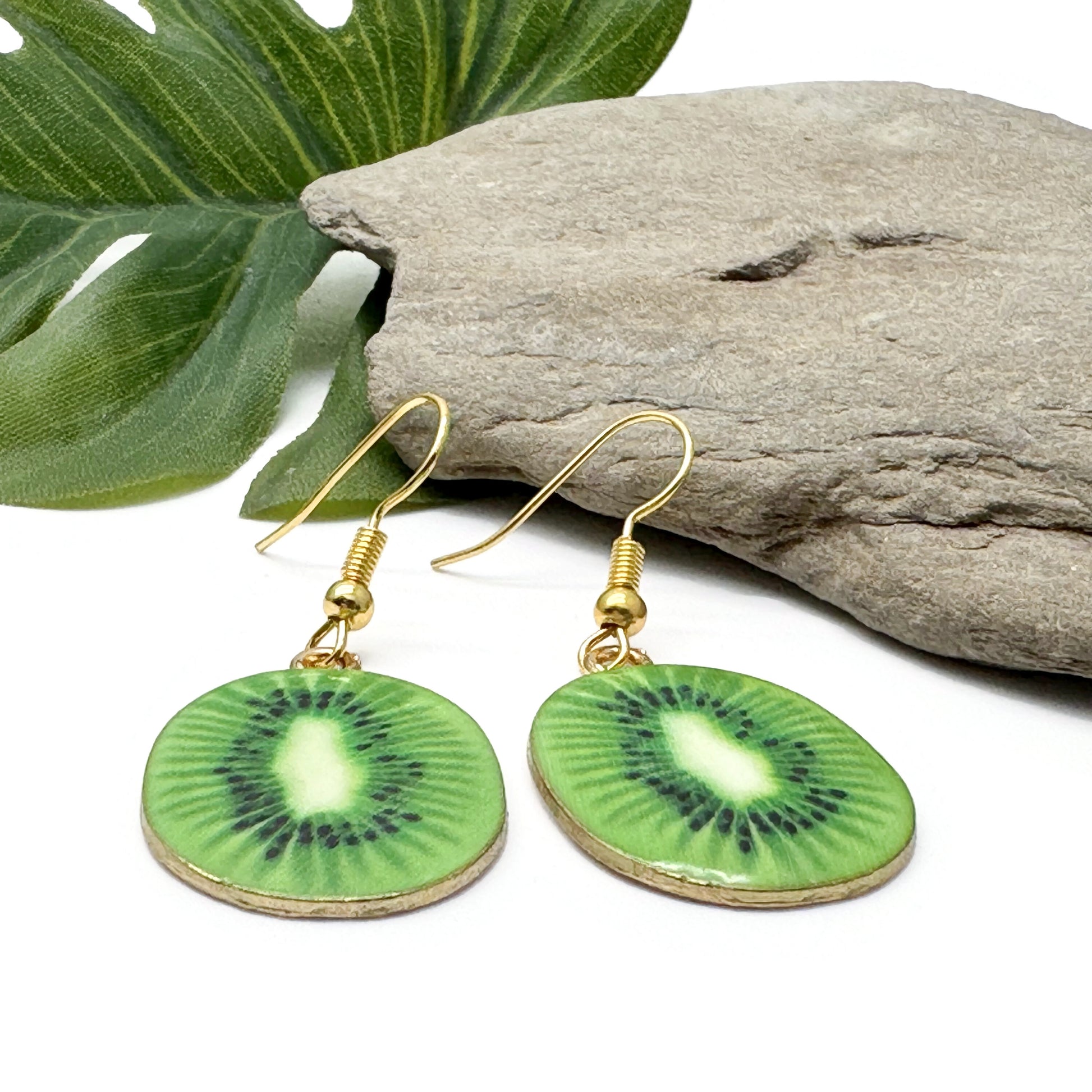 Kiwi Charm Earrings, Green Fruit Slice Enamel Charm Beads