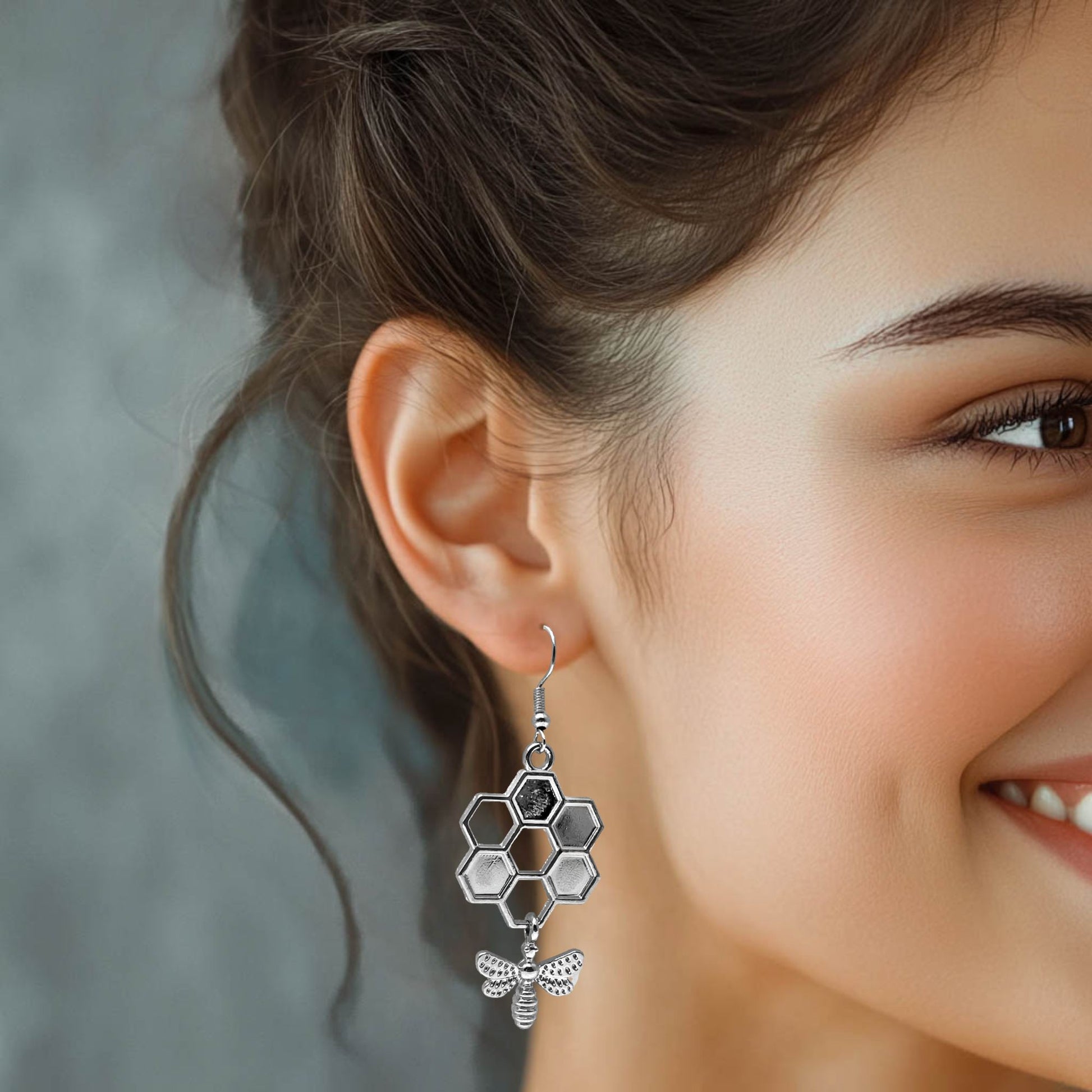 - Super cute earrings featuring bees dangling from a honeycomb charm in a shiny silver alloy, mounted on nickel free silver tone ear wire hooks.