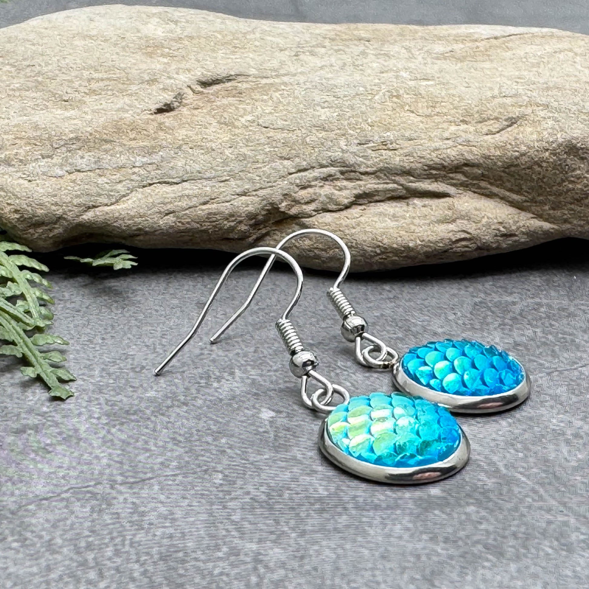 Mermaid Earrings, Shiny Blue Scale Charm Beads on Silver Tone Hooks