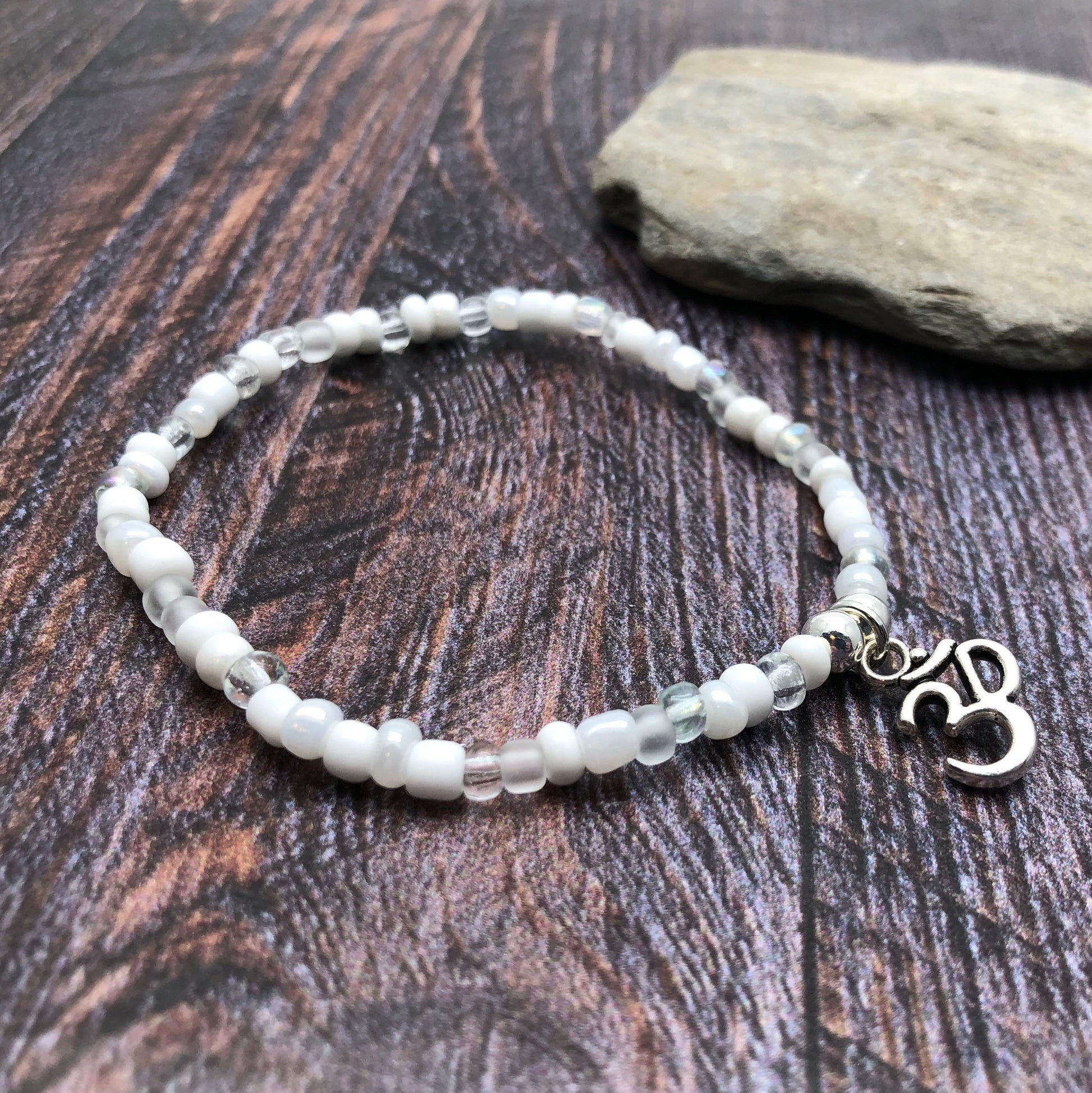 Dainty and delicate charm bracelet with a cute silver Ohm charm and 4mm glass seed beads, on strong elastic thread. Perfect thoughtful little gift for a mindful friend!