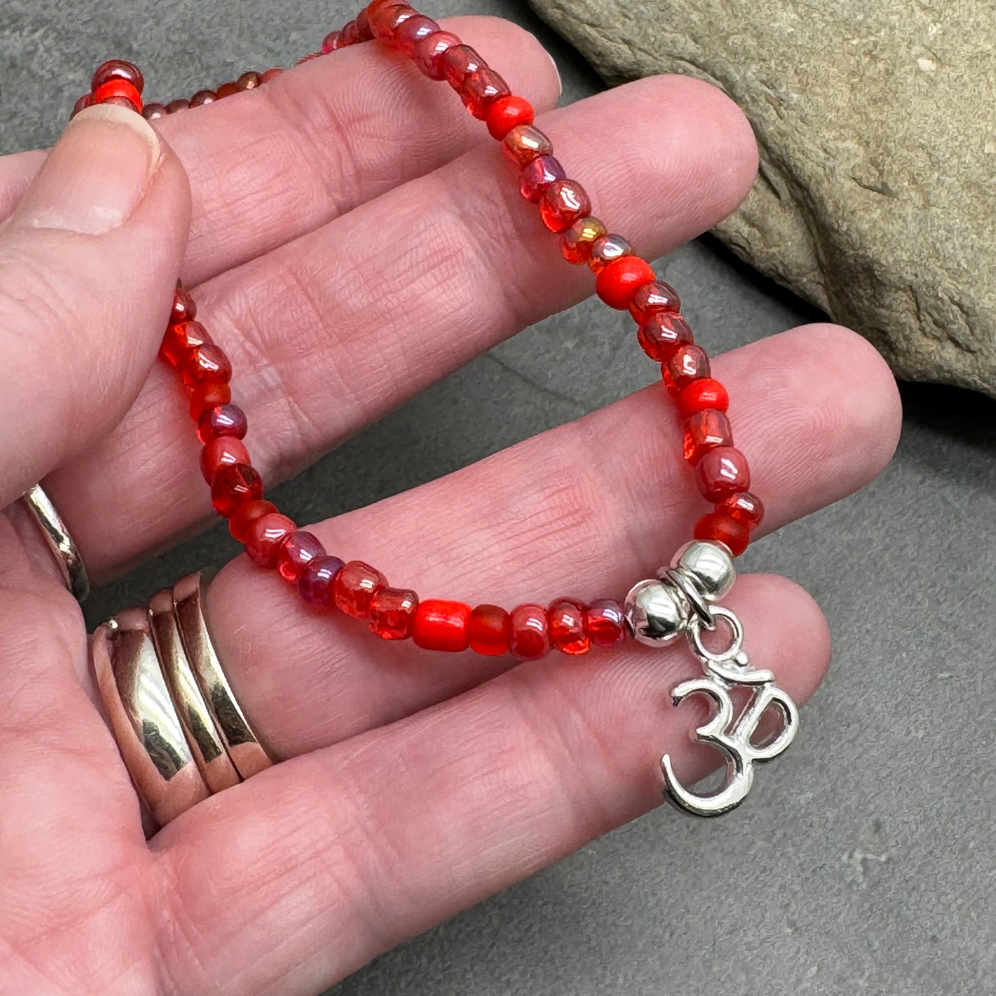 This beautiful beaded anklet is made of 4mm glass seed beads and a little silver tone Ohm charm, thread on strong elastic.