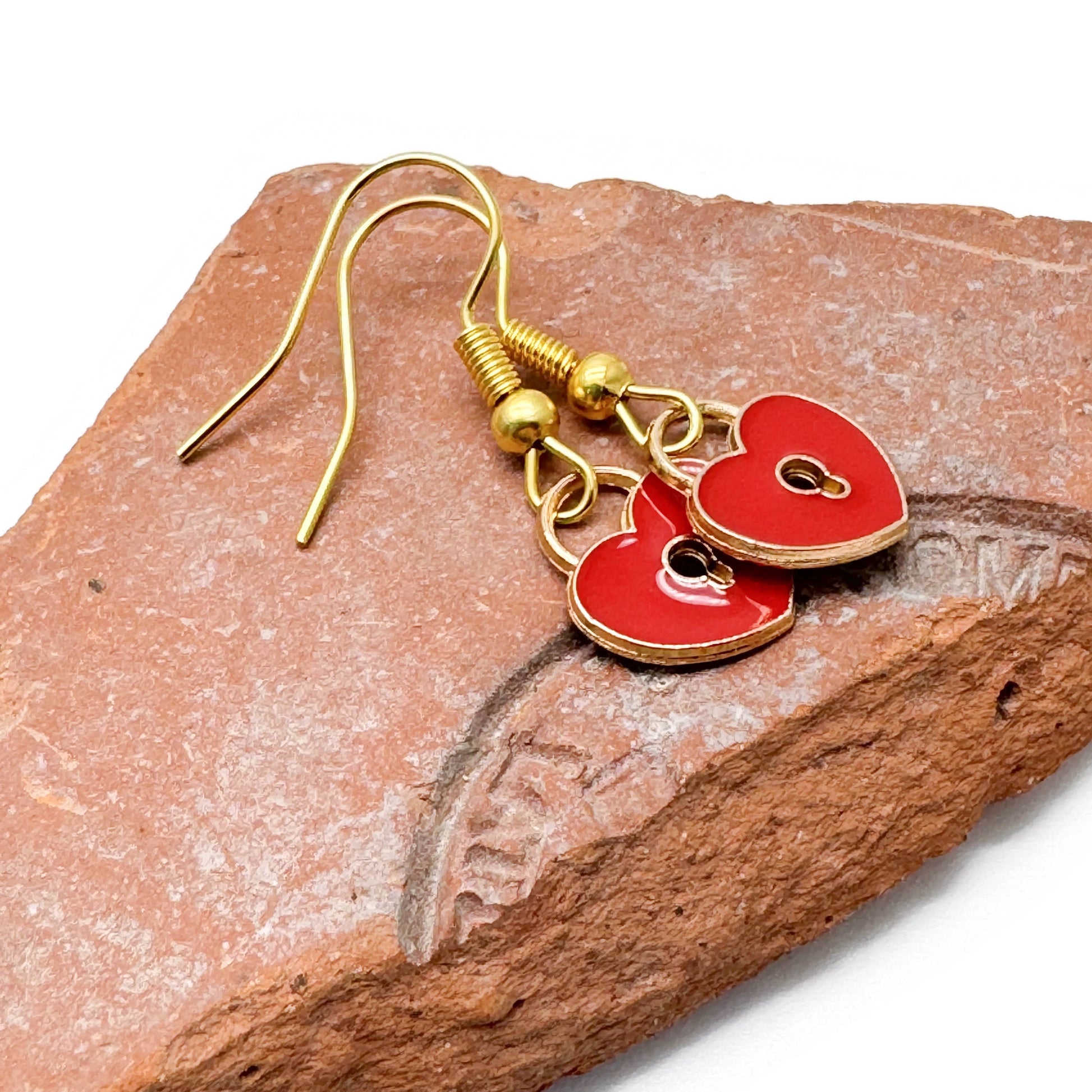Heart shaped red enamel padlock charms, mounted on nickel free gold tone hooks.