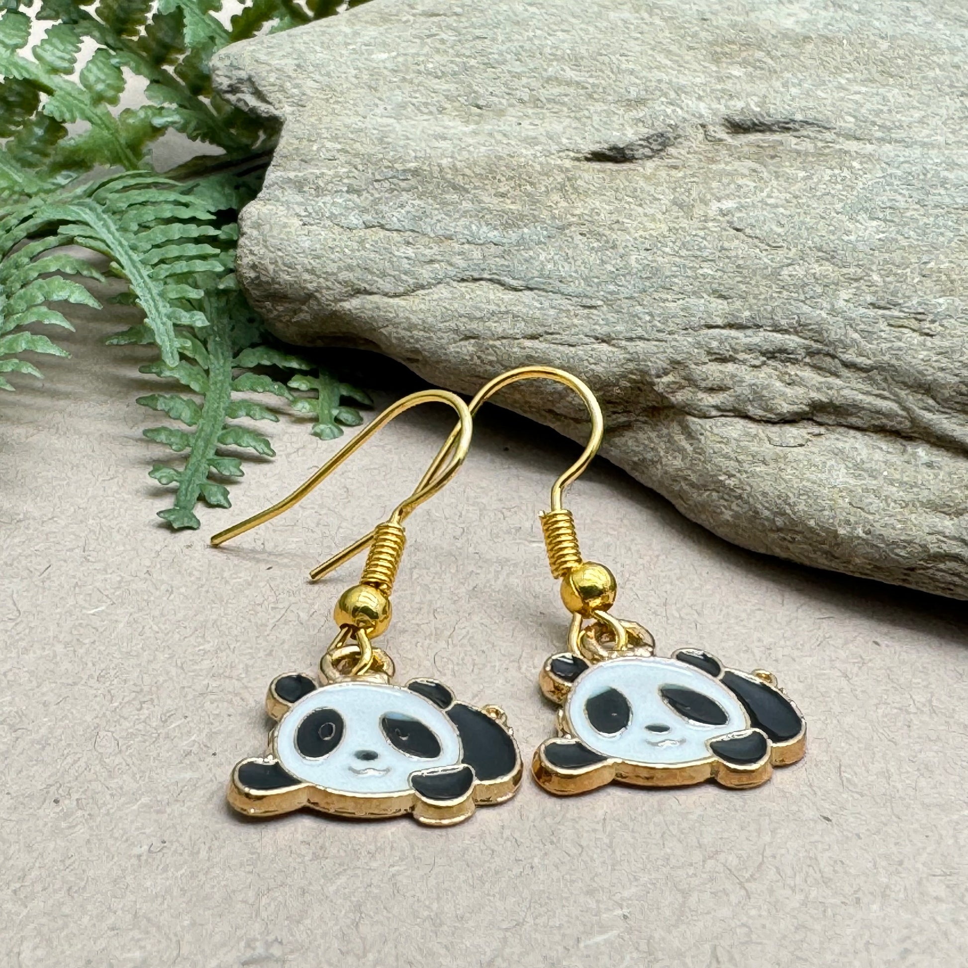 Super cute charm bead earrings in the design of an adorable little panda, with black and white enamel mounted on gold tone hooks.