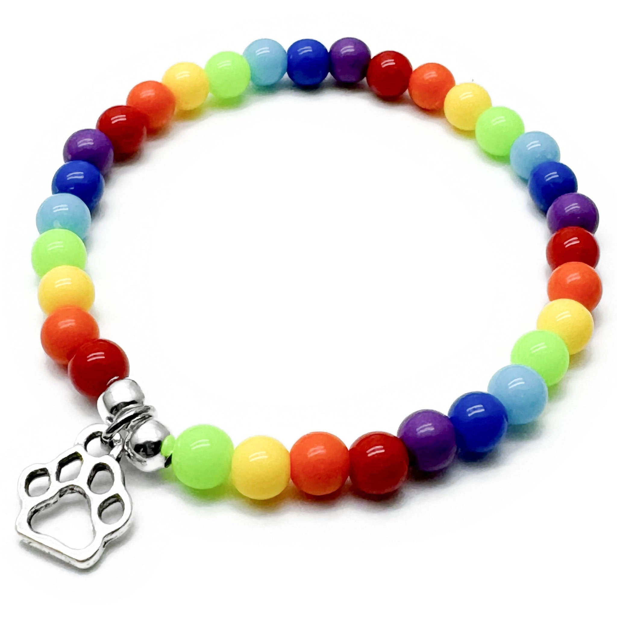 This acrylic bead bracelet has a cute little silver tone paw print charm, and is thread on strong elastic. It’ll roll onto your wrist easily.