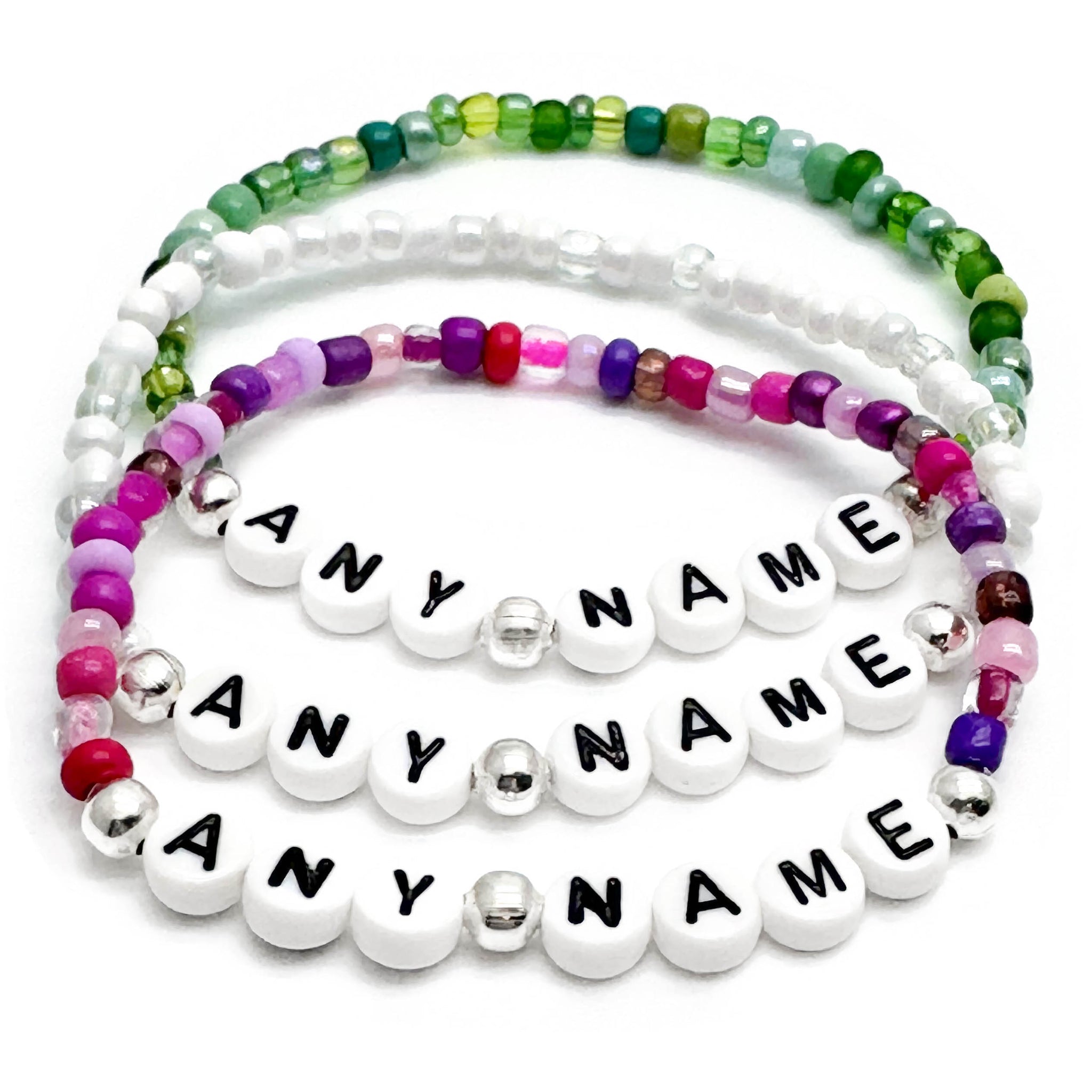 Choose any word or name you'd like on this personalised glass seed bead bracelet! Your name, the name of your partner or your child, an initial, a secret letter code only you know, a band name or artist, an inspirational word, your favourite sports team or anything else you can think of.