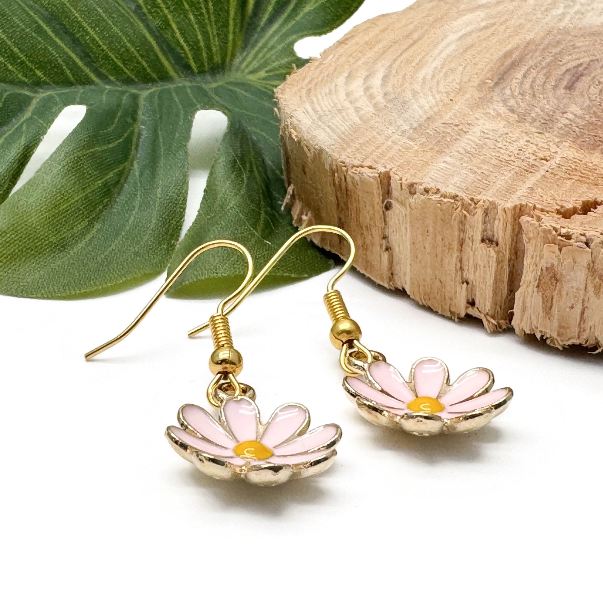 Pink Daisy Earrings, Enamel and Gold Plated Floral Charm Beads