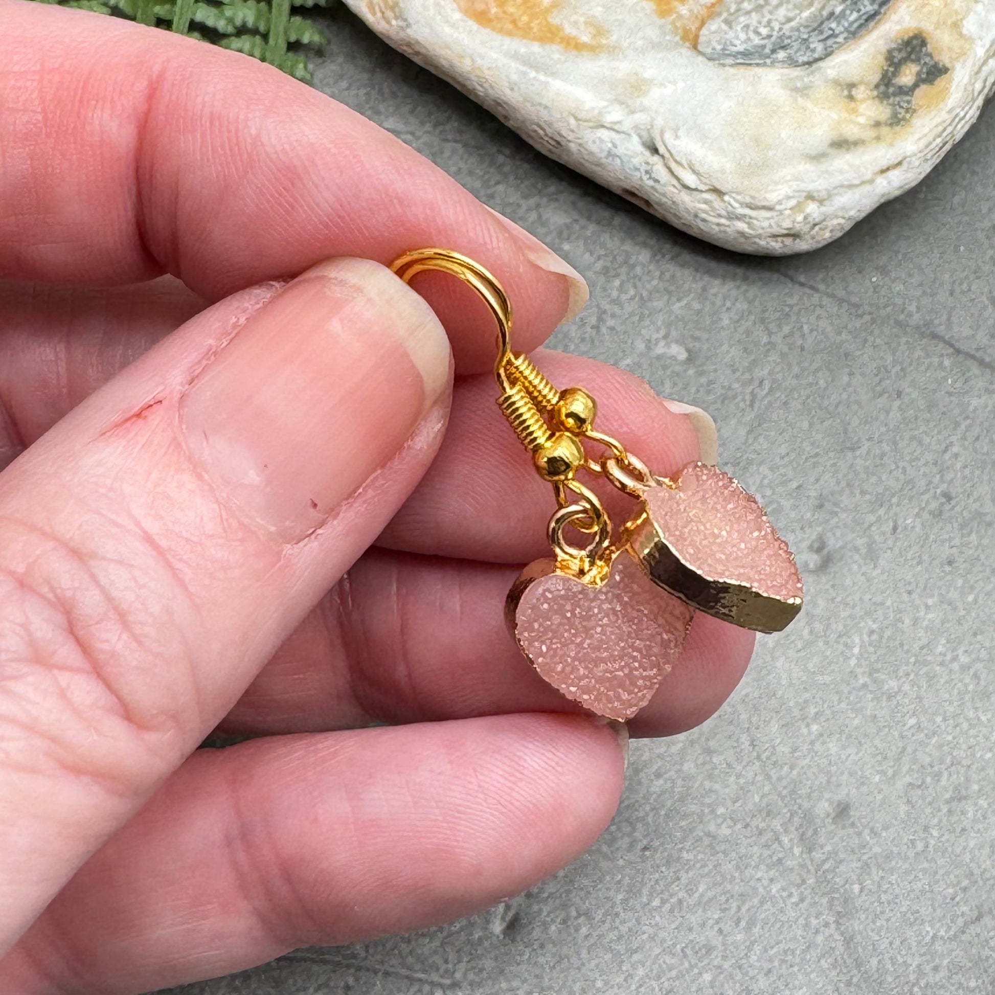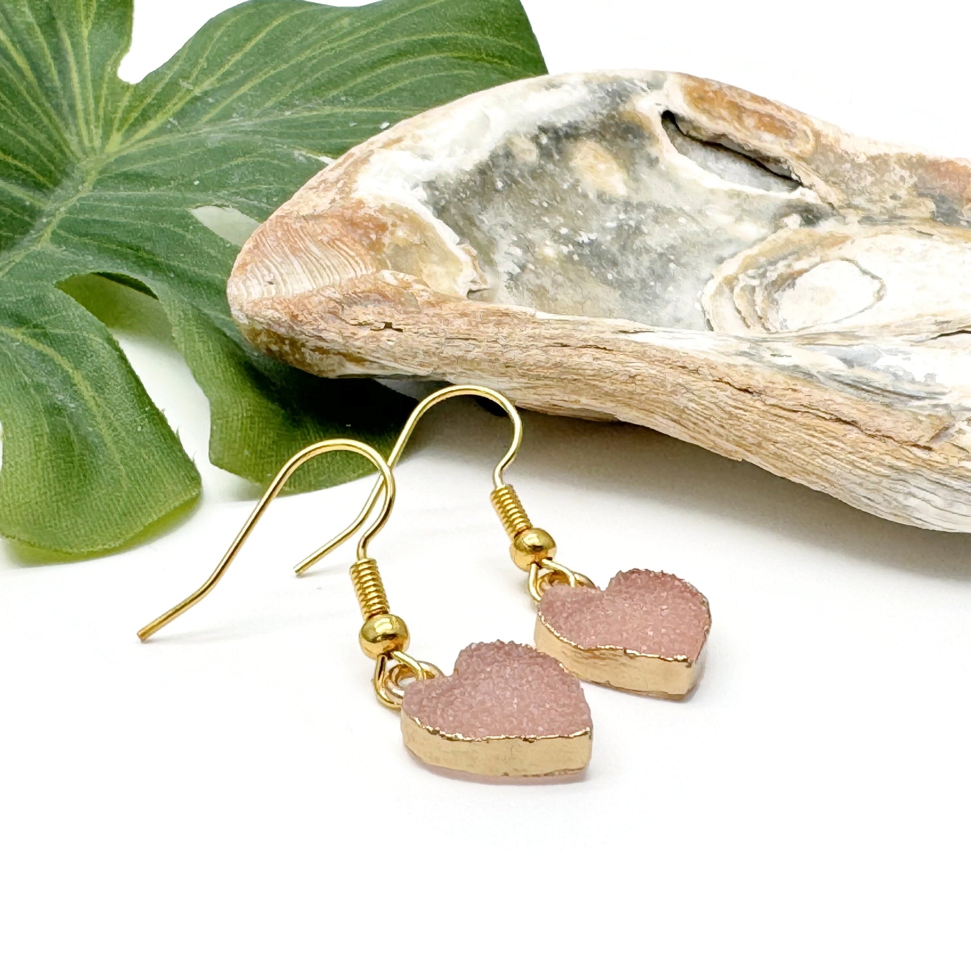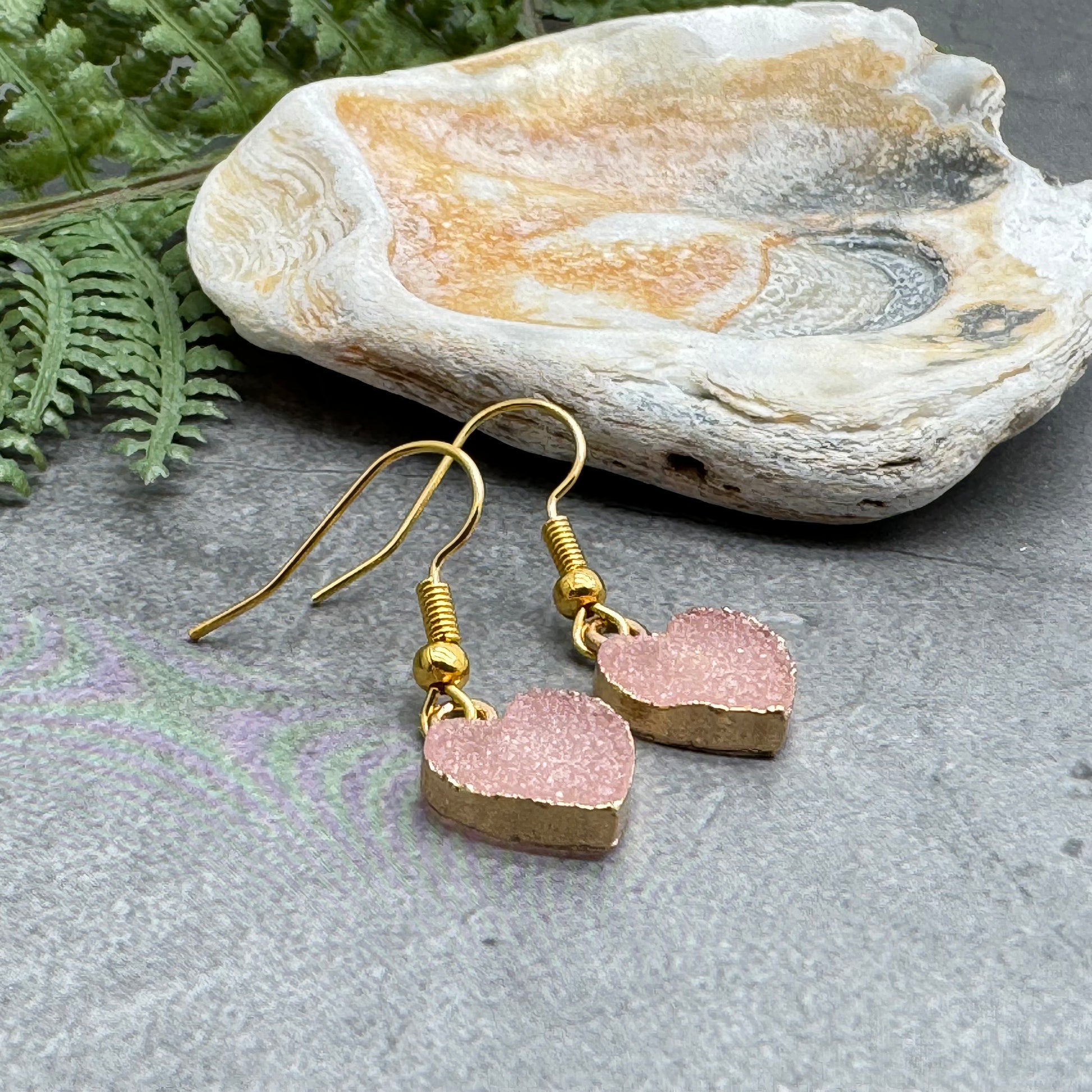 Pretty and dainty bead earrings, with gold electroplated druzy resin heart charms in a gentle pale pink.