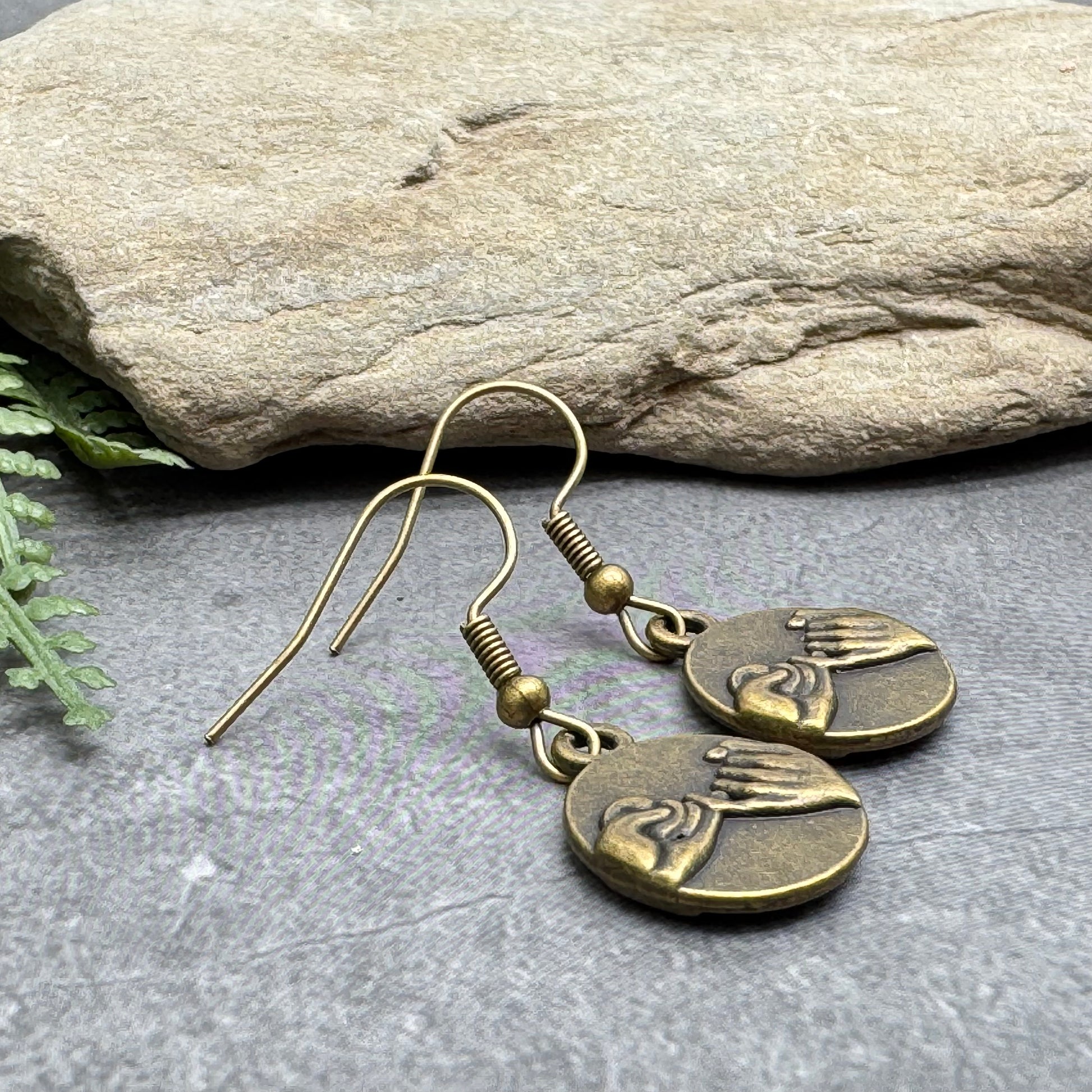 Dangly earrings with antique bronze tone alloy Pinky Swear charms, mounted on matching ear wire hooks.