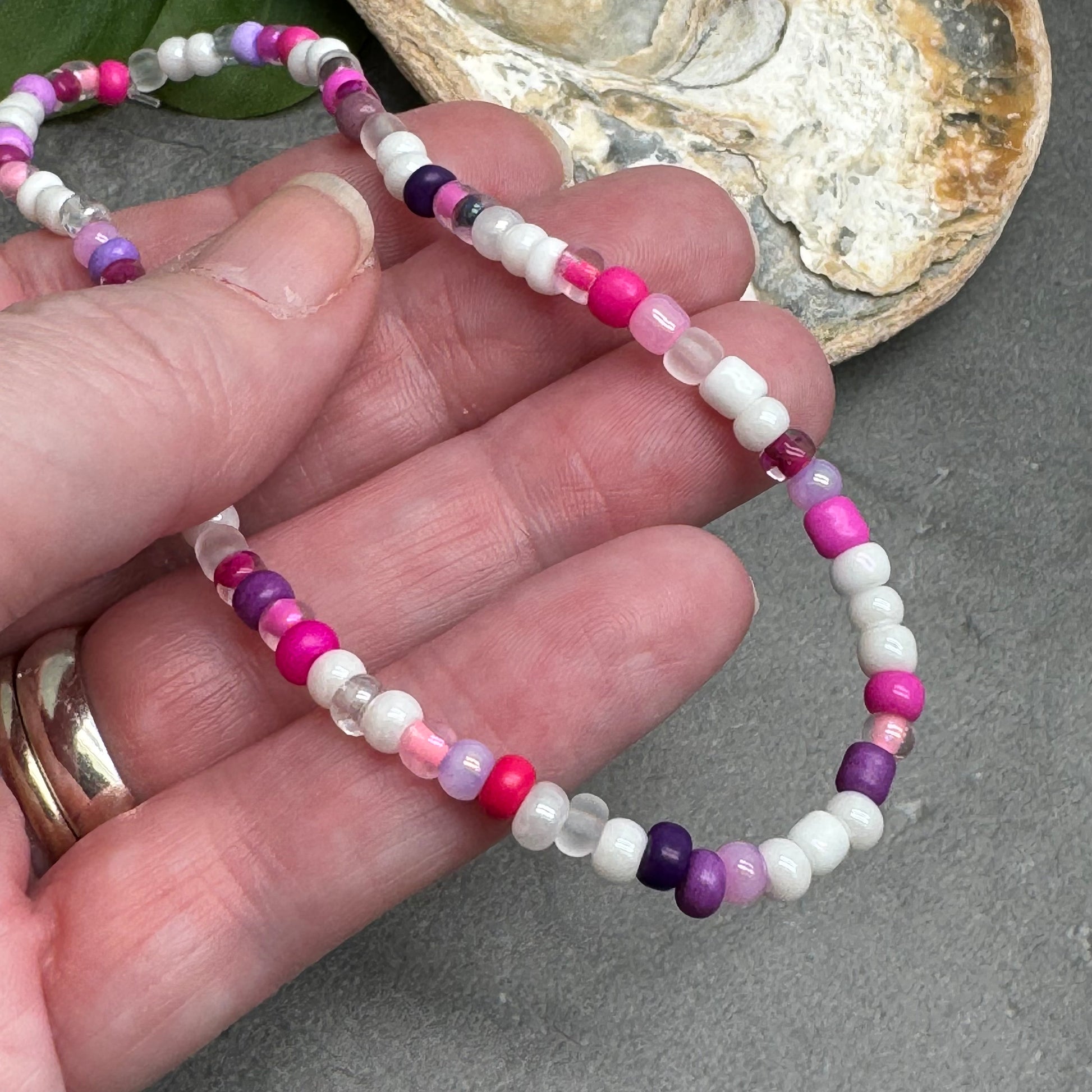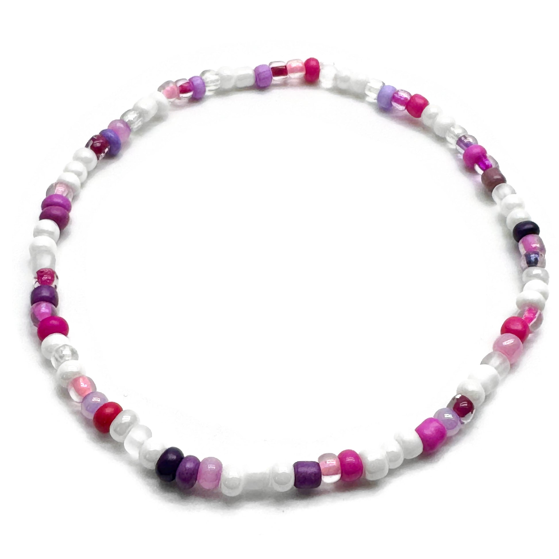 This colourful plain bead anklet is a fantasy inspired item made with 4mm glass seed beads in various pretty pink, purple and white shades on strong elastic.