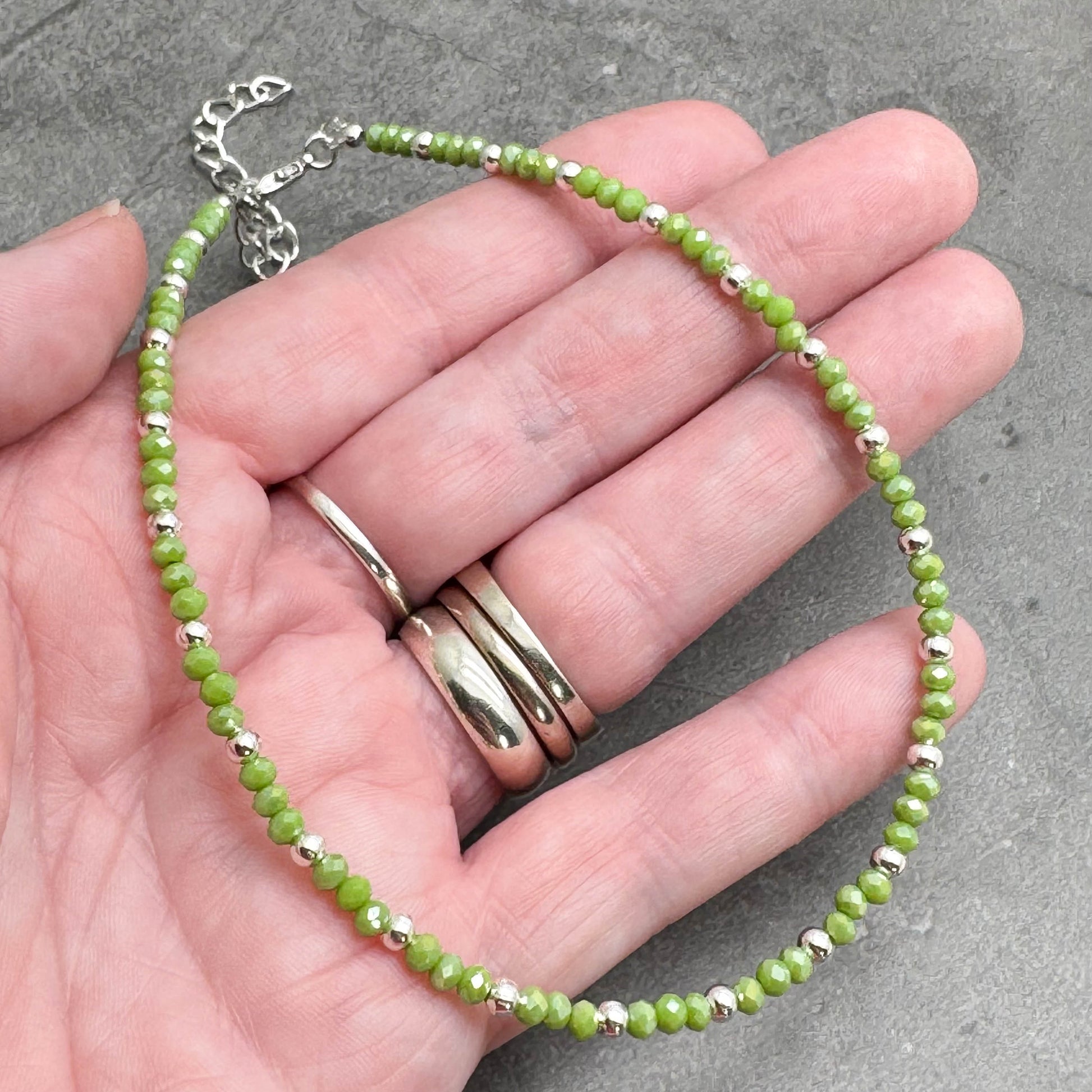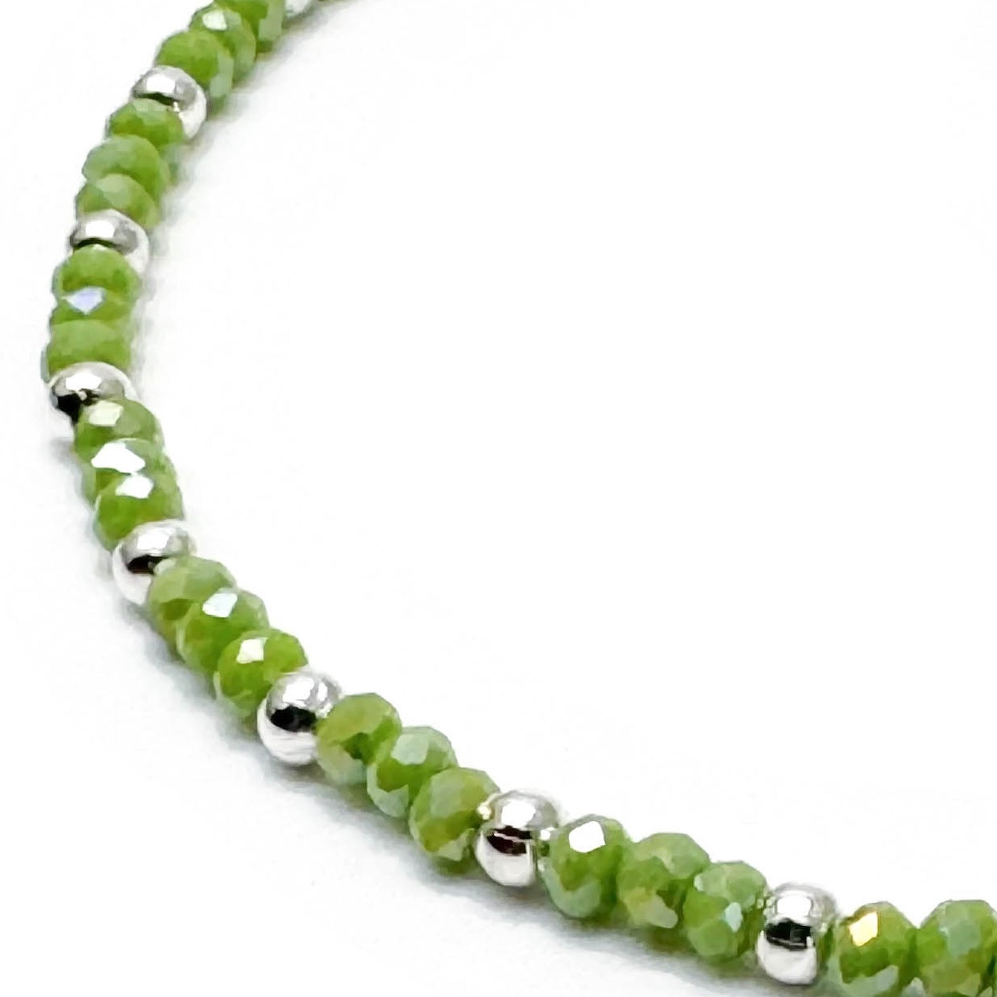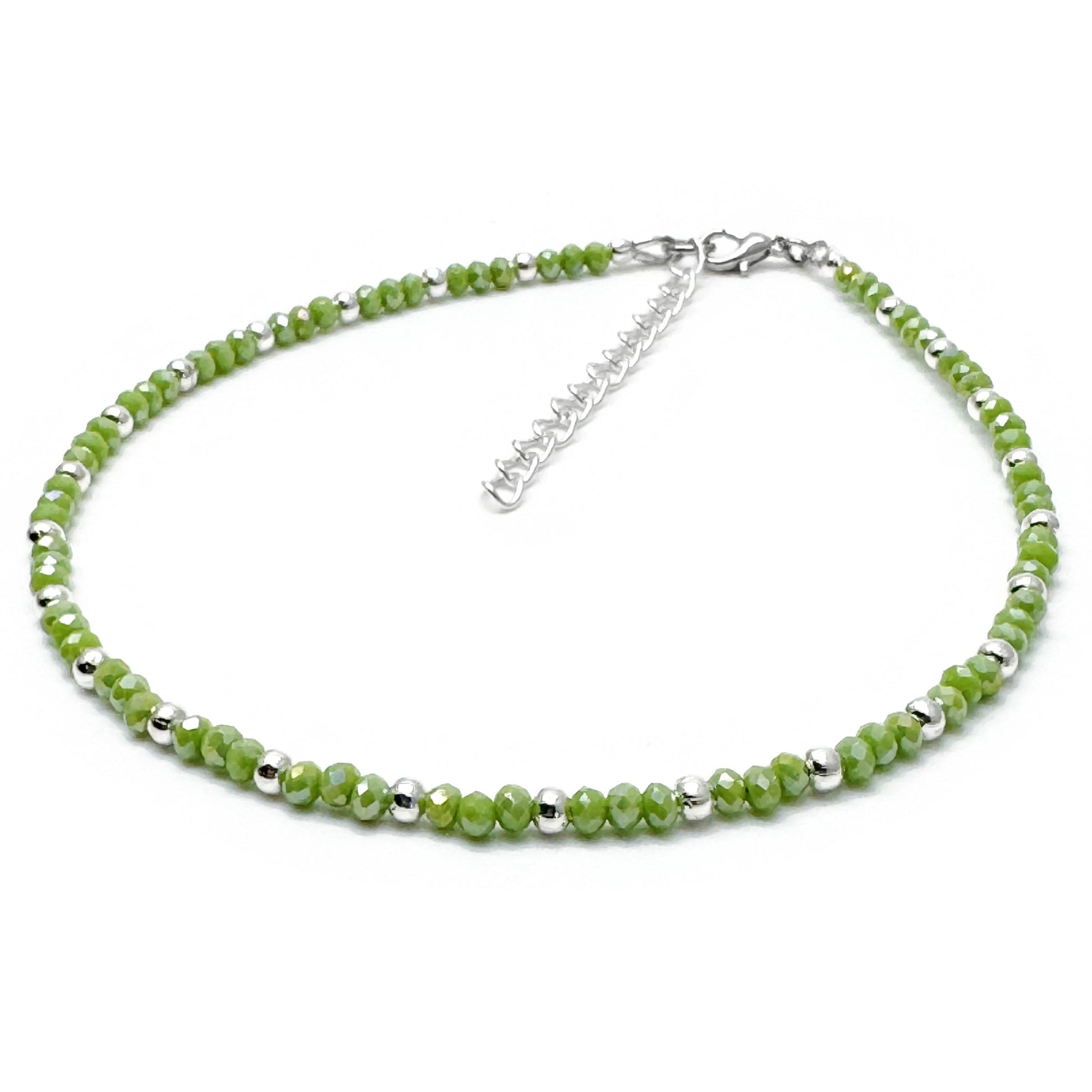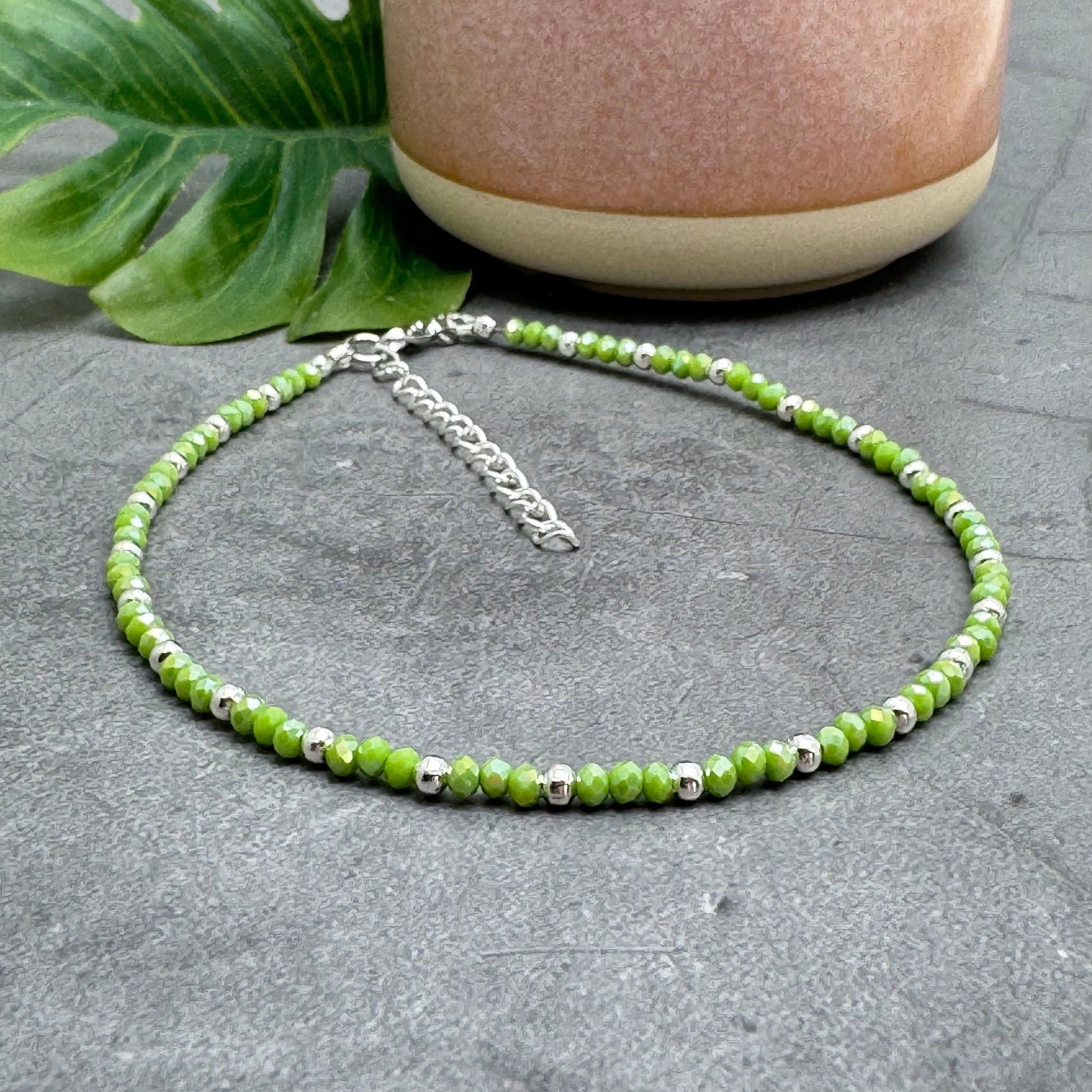 - Super cute bead anklet with small faceted glass seed beads in gorgeous shimmery lime green, and silver spacer beads, in a casual everyday style.