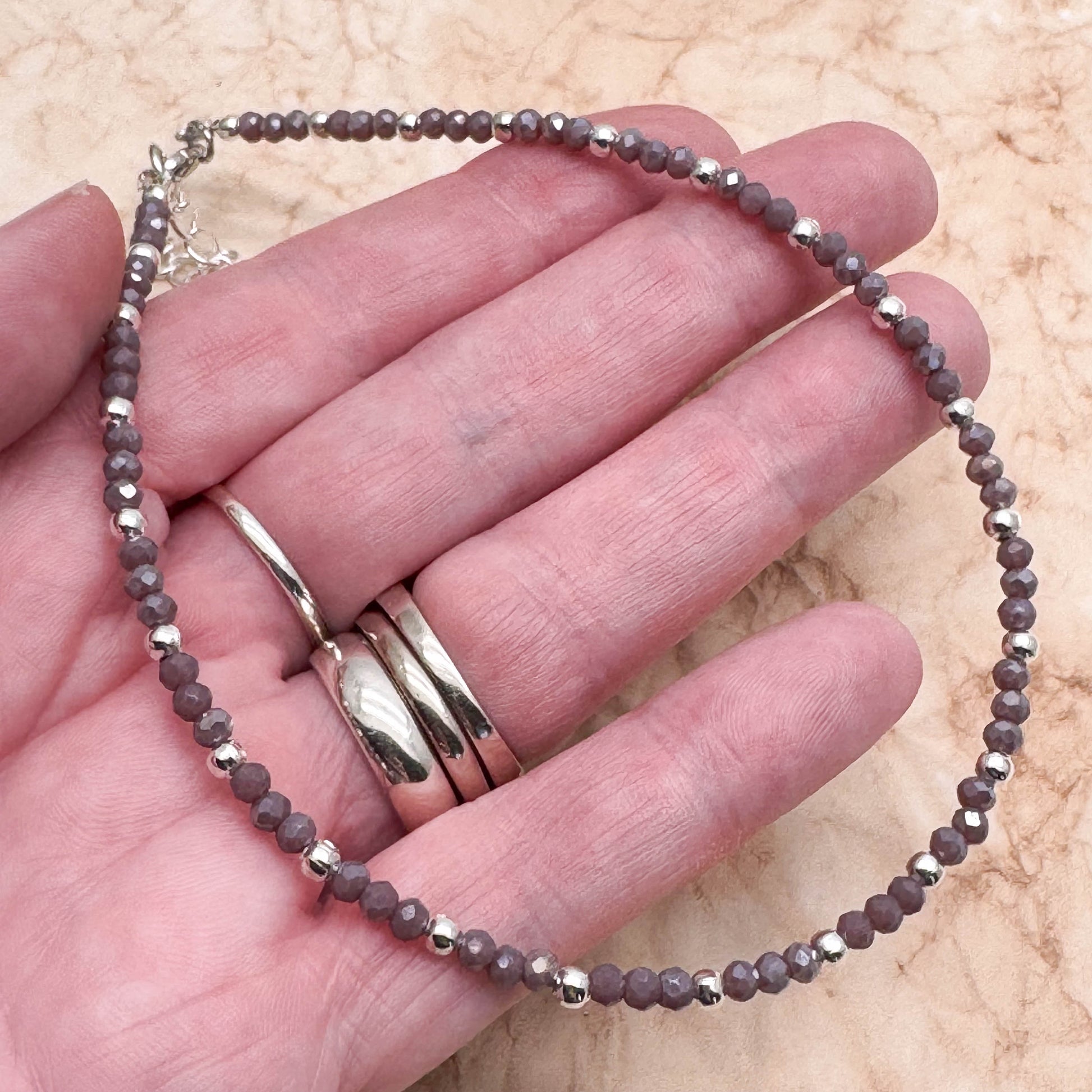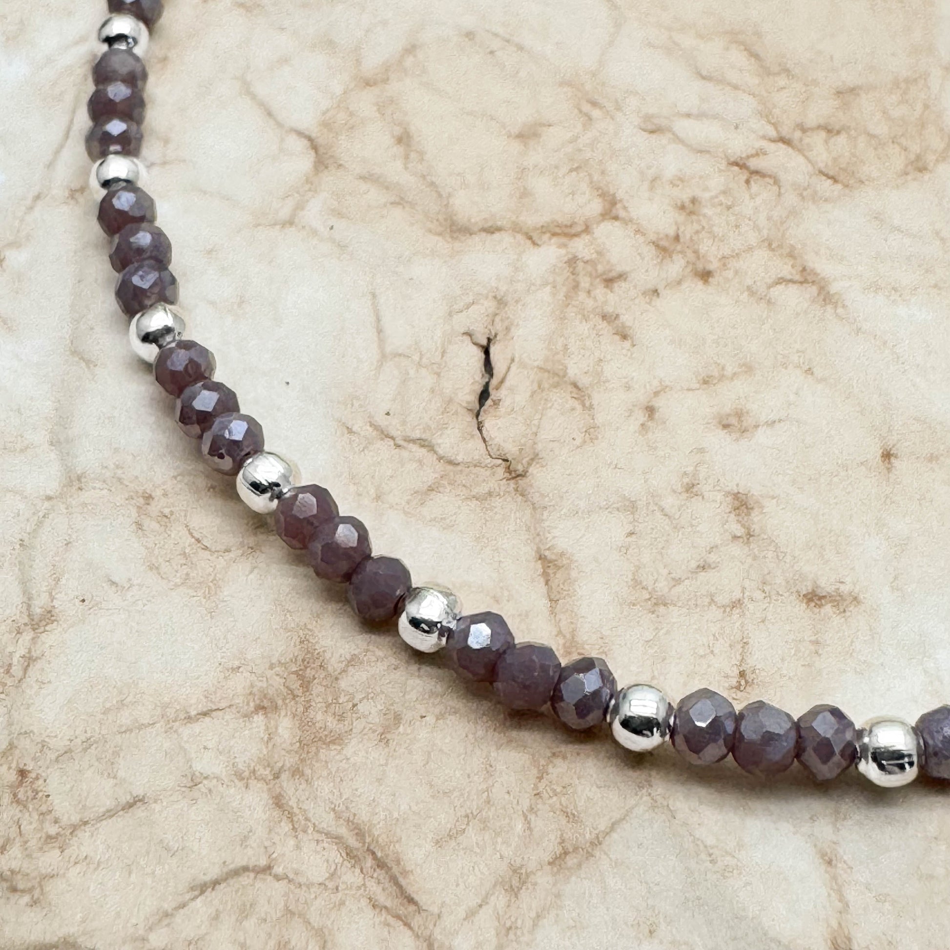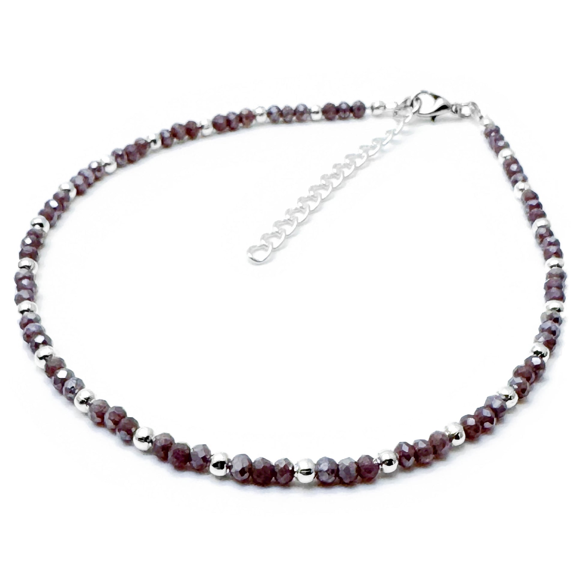 - Super cute bead anklet with small faceted glass seed beads in gorgeous shimmery greyish purple, and silver spacer beads, in a casual everyday style.