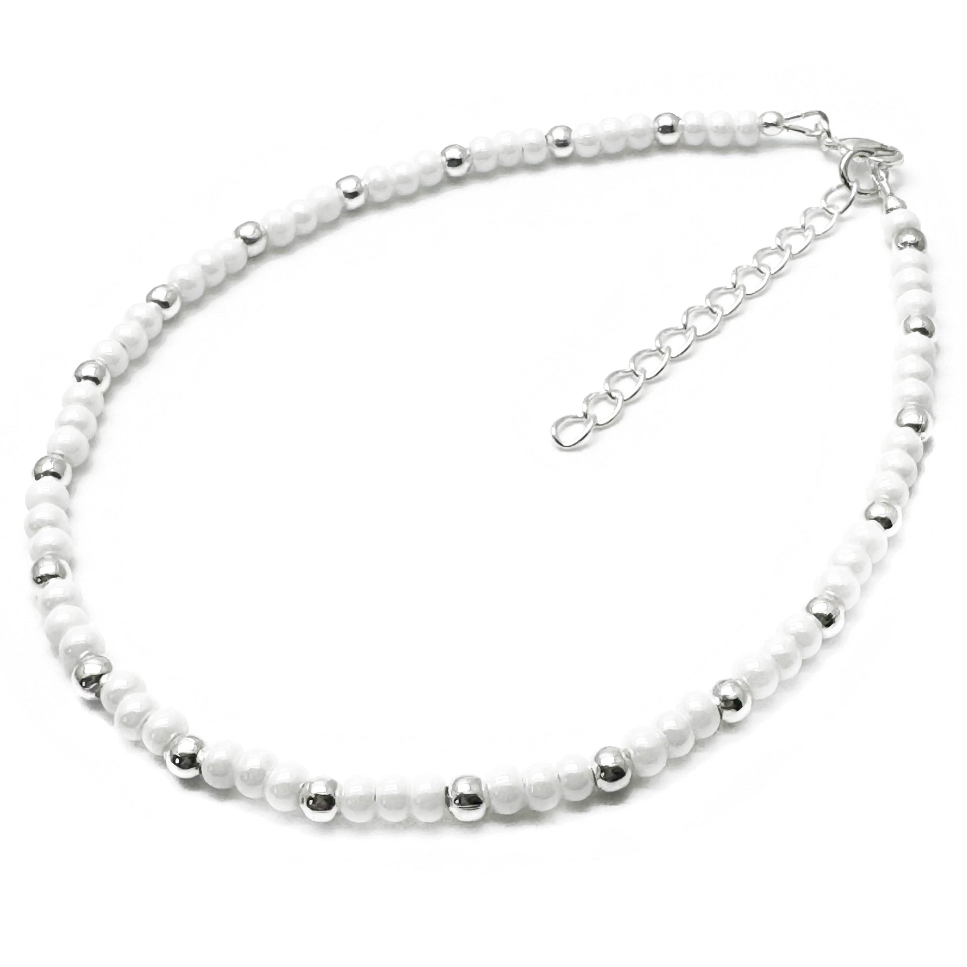 Super cute bead anklet with small glass seed beads in gorgeous shimmery white and silver spacer beads, in a casual everyday style.