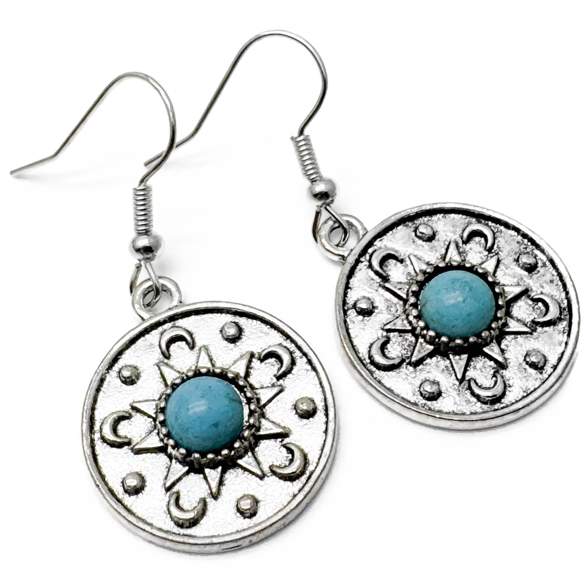 - Silver tone round charm earrings in a rustic antique look design, with a round synthetic turquoise blue stone.