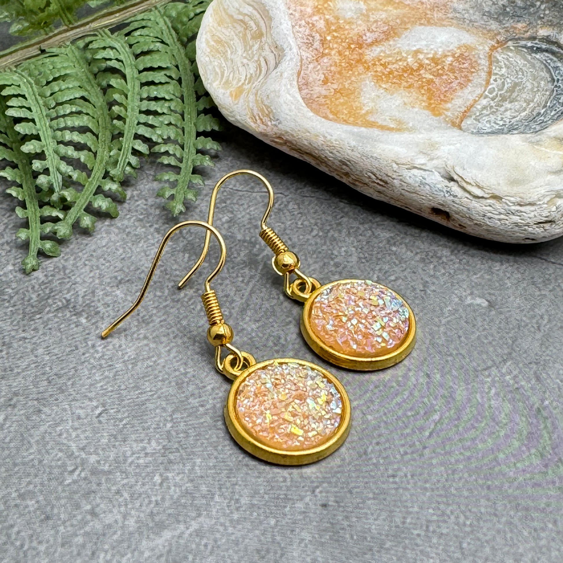 Pretty and dainty bead earrings, with gold electroplated druzy resin charms in a gentle pale beige shade with some pretty pink notes. The resin resembles druzy agate, and has a irregular texture and a beautiful shimmer that hits the light in a pretty way.