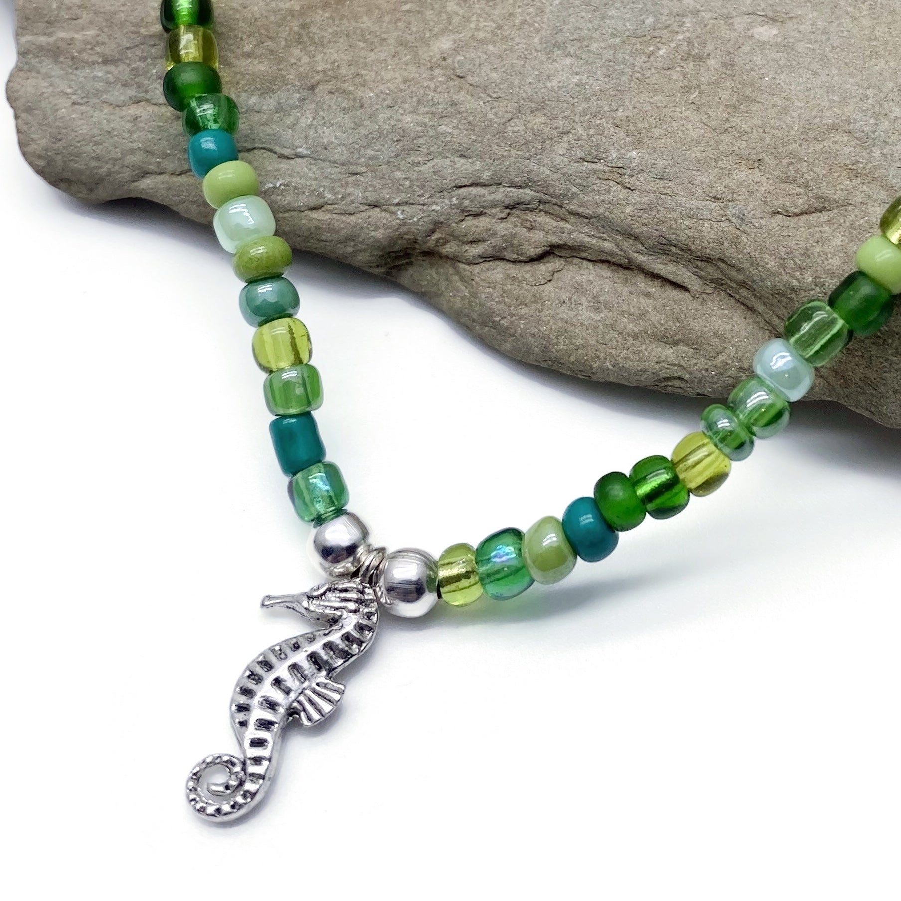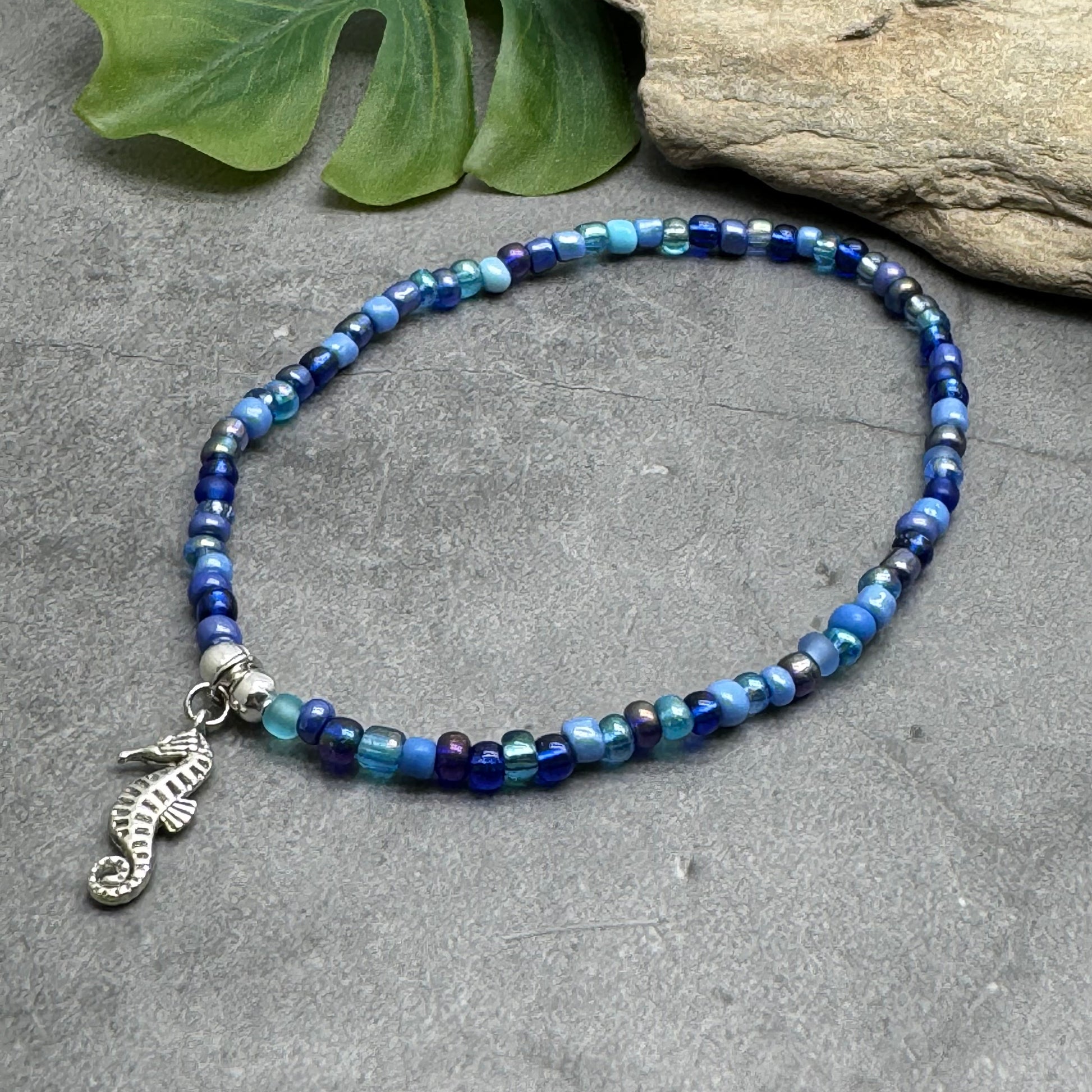 This little ocean inspired anklet is made of 4mm glass seed beads and a charm with a cute silver tone seahorse, and it's thread on strong elastic. The perfect little gift idea for a beach lover!