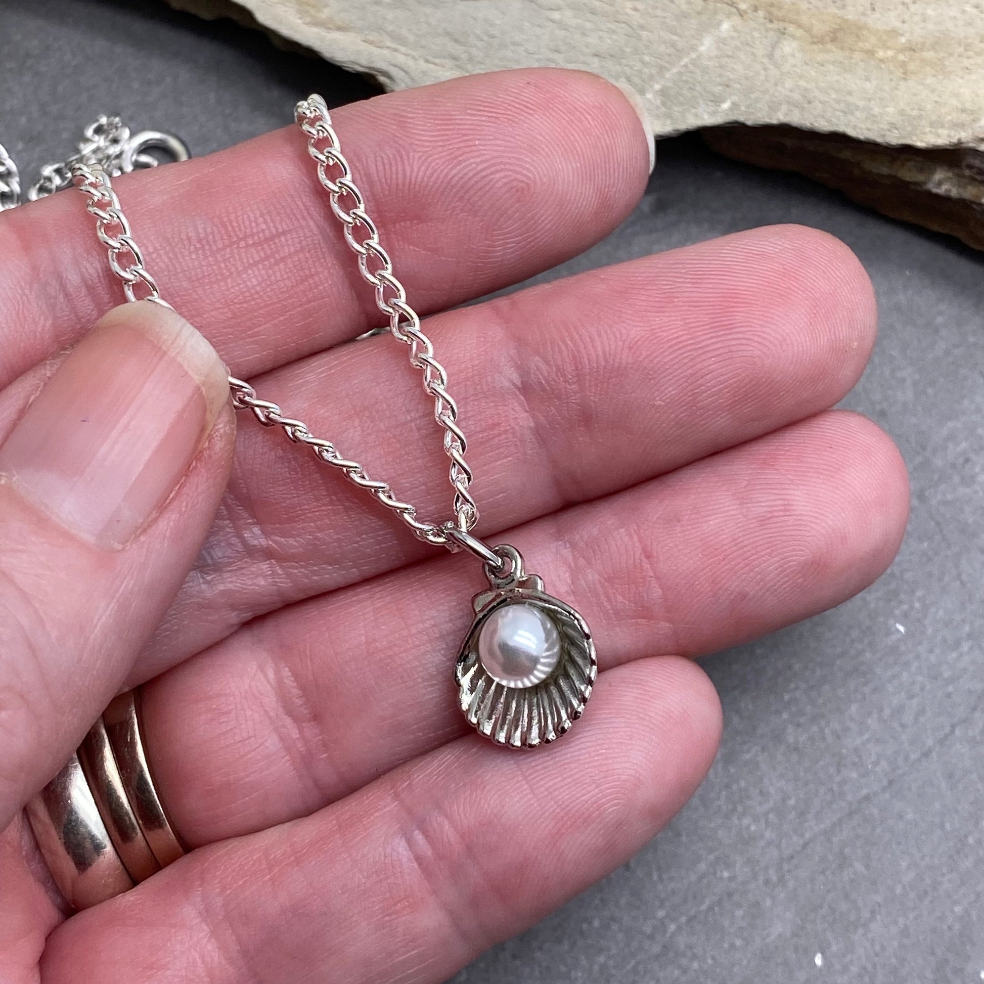 A pretty little silver tone metal shell charm with a faux pearl inside. The charm measures 15x12mm, and it comes on a slim silver plated curb chain.