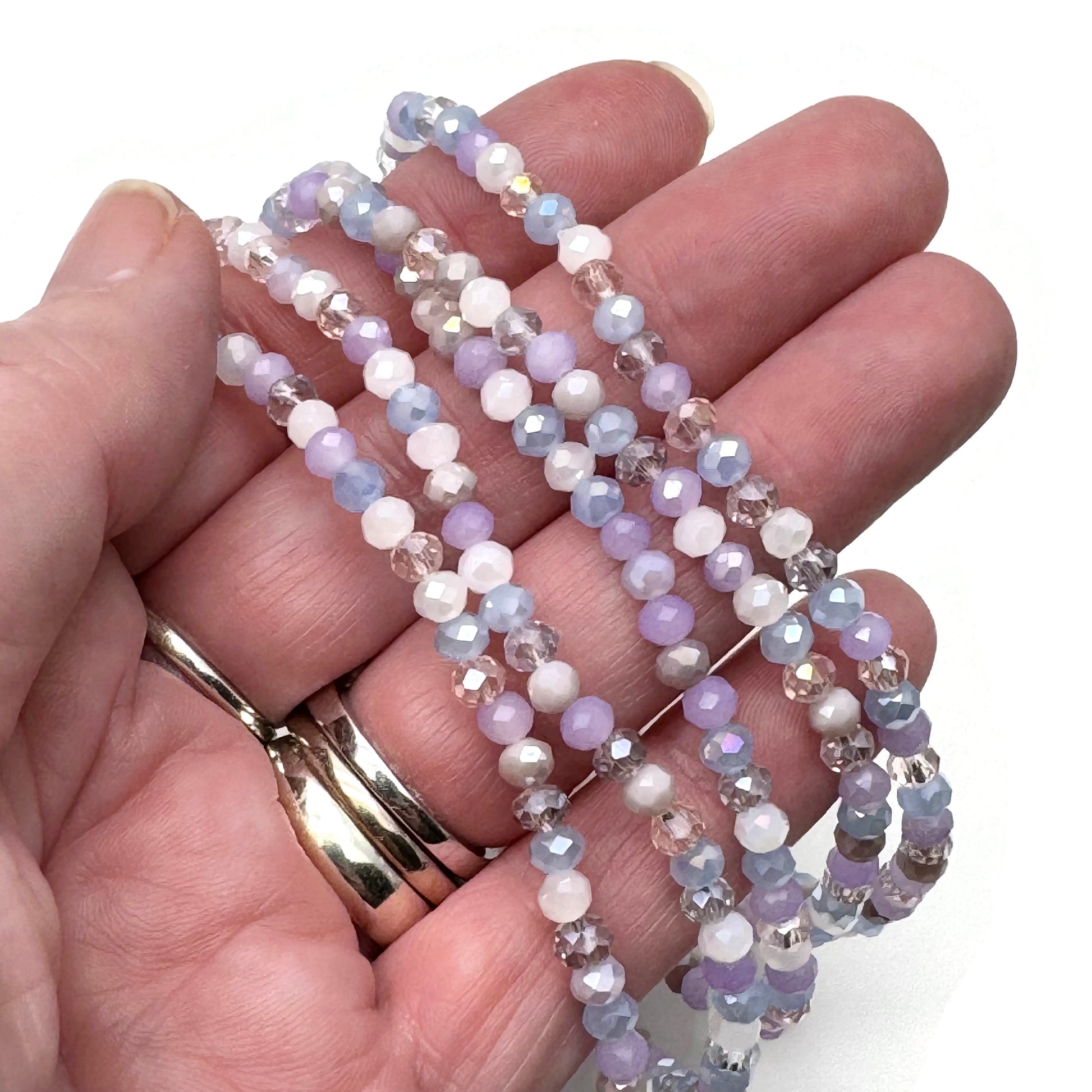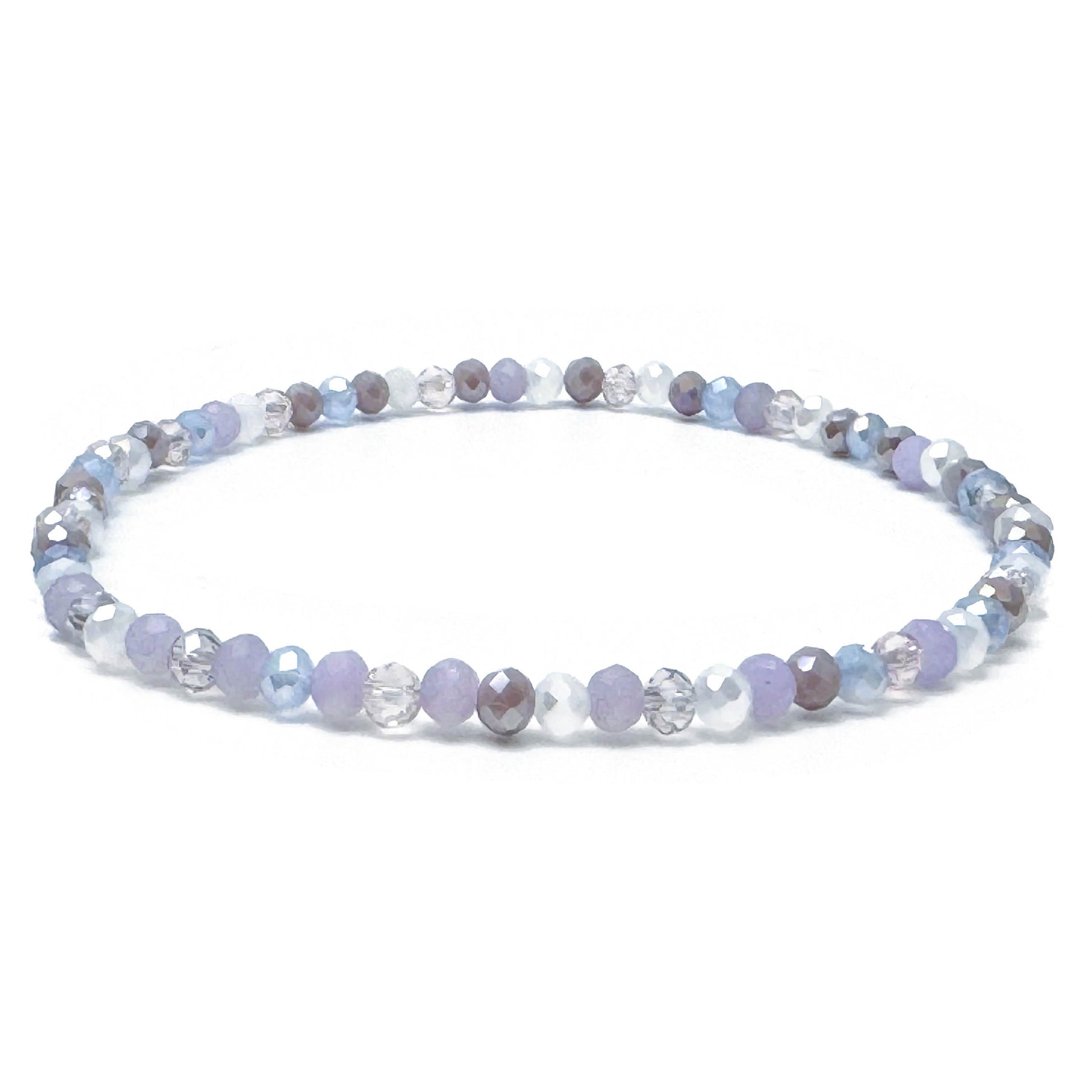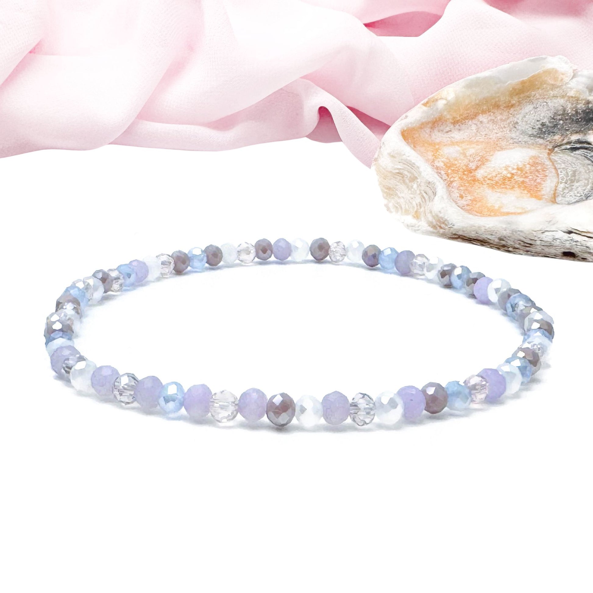 Cute pale pastel colour bead anklet with small faceted glass beads, beaded on strong elastic thread. A beautiful and random mix of 4mm faceted glass beads in pale pink, lilac, white and pale blue.
