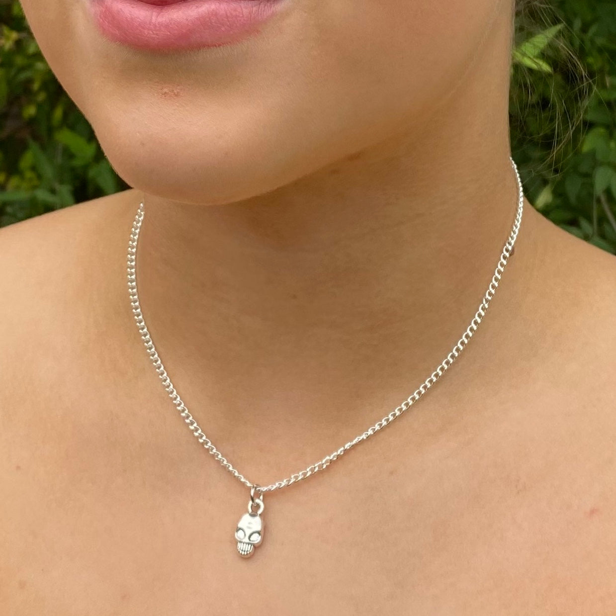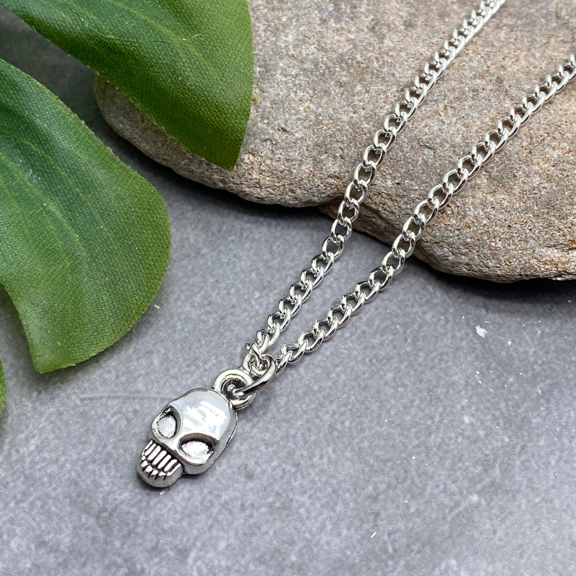 A trendy silver tone metal skull charm on a slim silver plated curb chain. Perfect for Halloween!