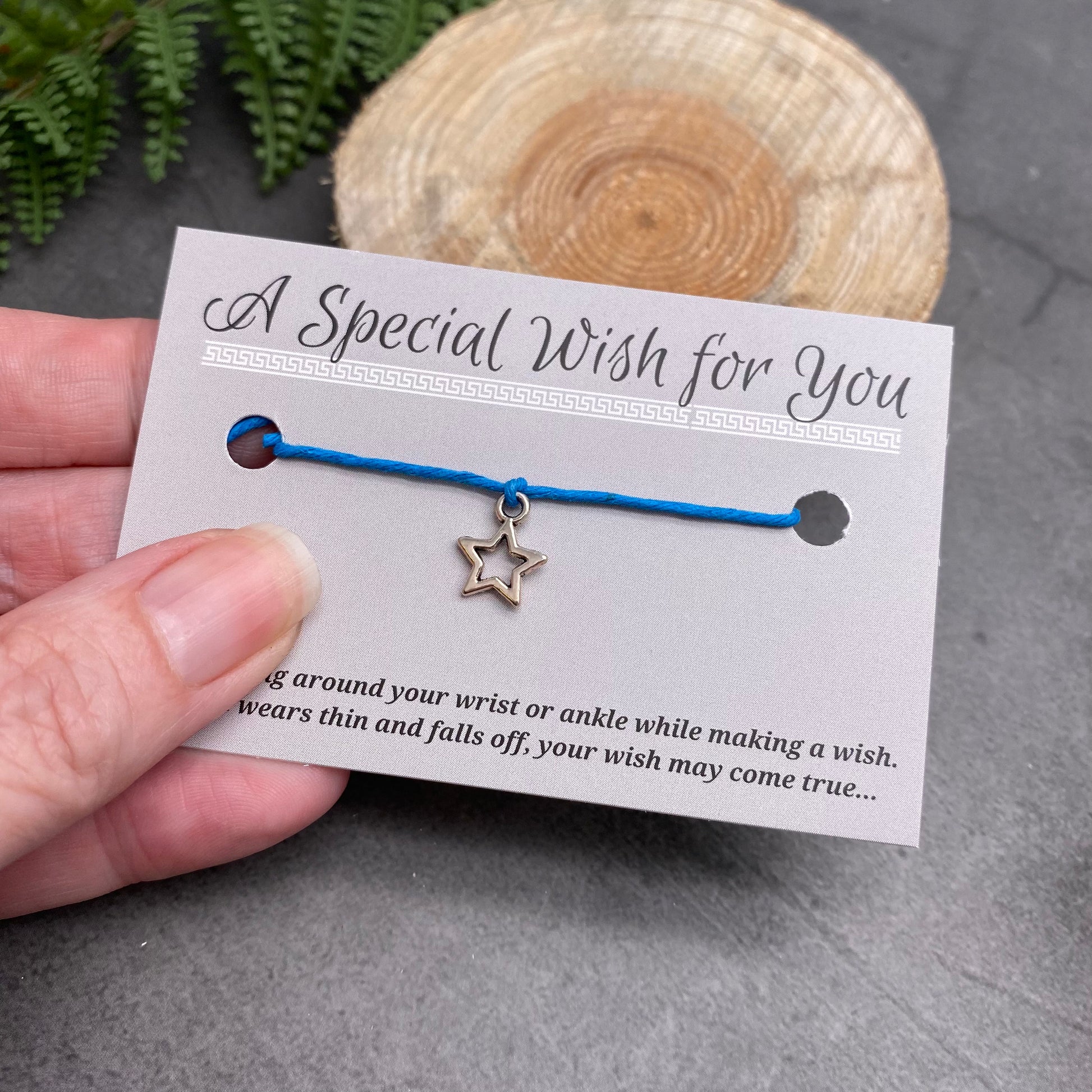 This pretty little star wish bracelet is ideal as a party favour, for birthday gifts or just to say thank you. A slim hemp string bracelet with a small Tibetan style silver tone hollow star charm. Comes presented on a business card sized printed card.