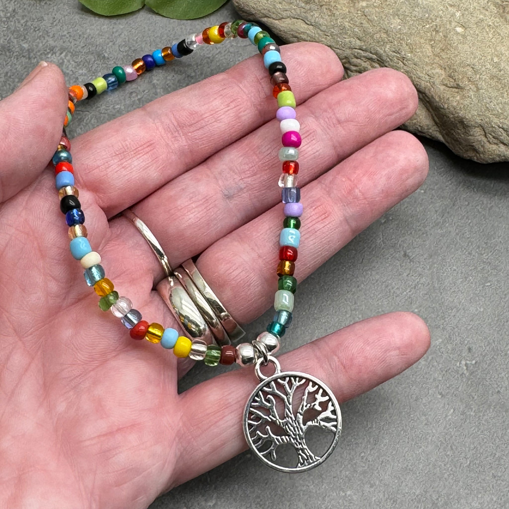 This beautiful beaded anklet is made of 4mm glass seed beads and a round silver tone Tree of Life charm, thread on strong elastic.