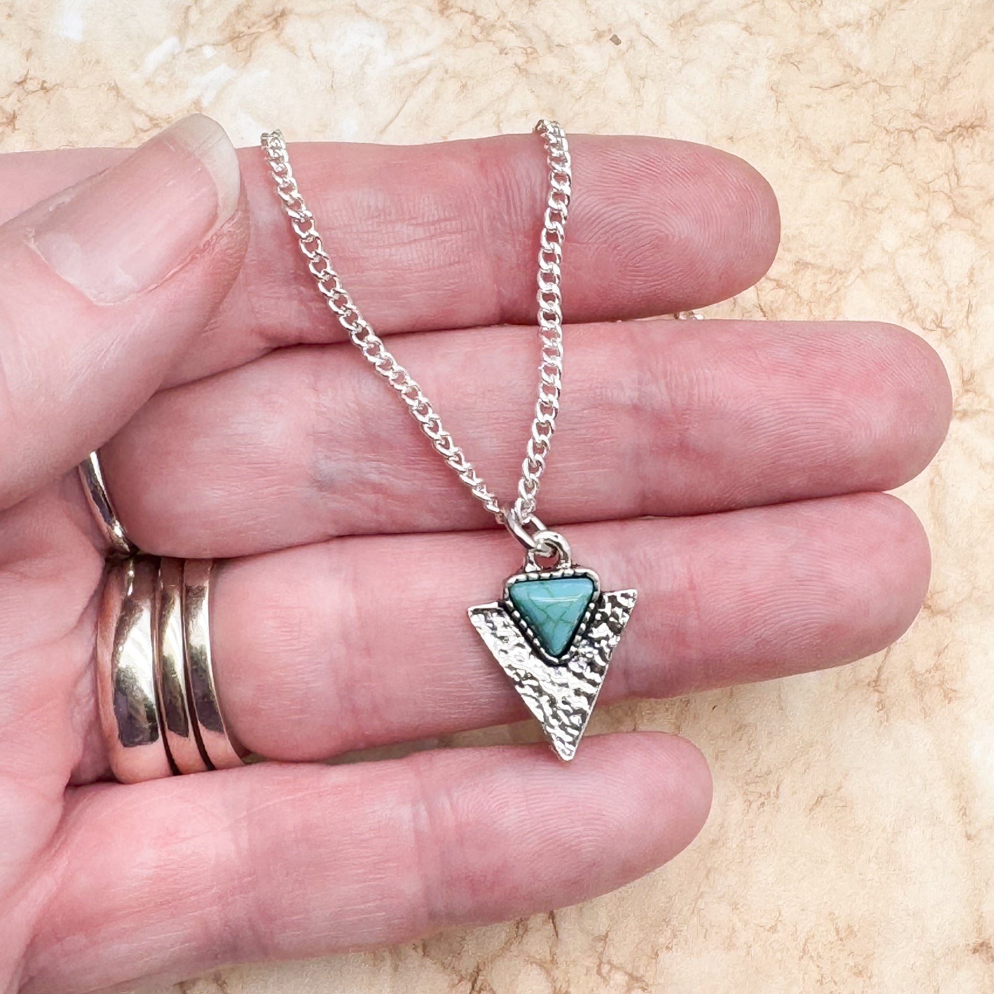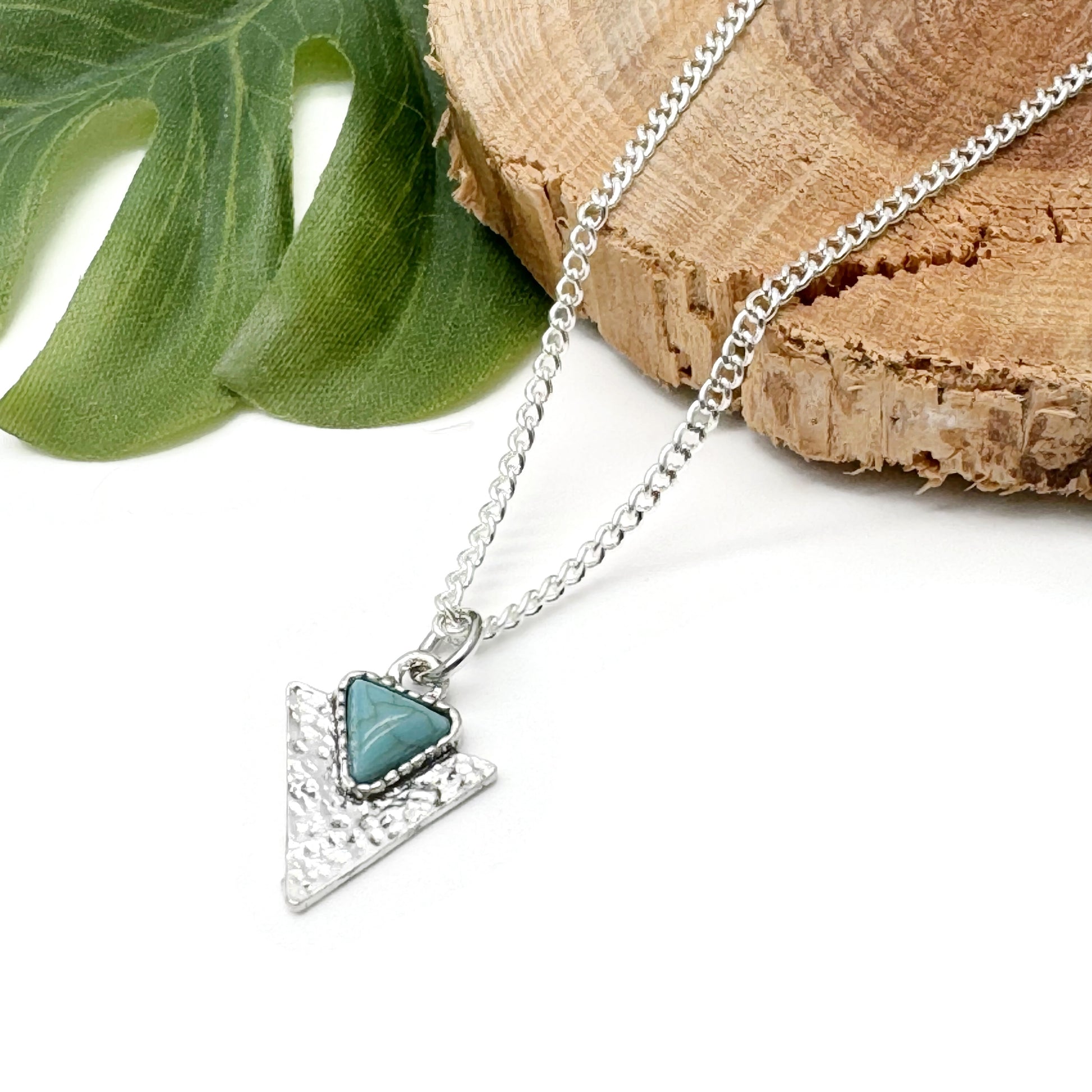 Silver tone triangular charm necklace in a rustic antique look triangle design, with a synthetic turquoise blue stone.