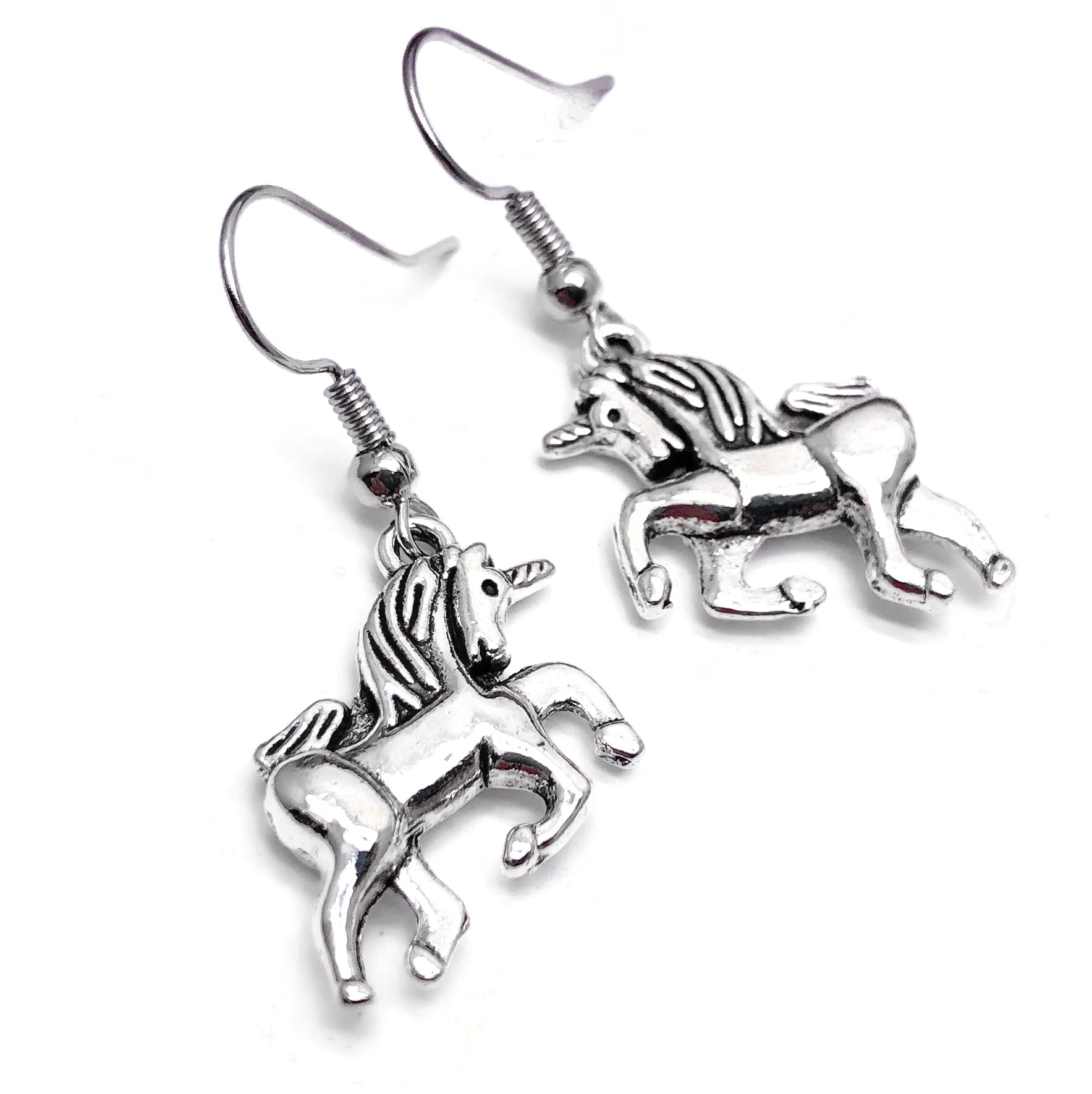 On trend and cute earrings with silver tone unicorn charms.