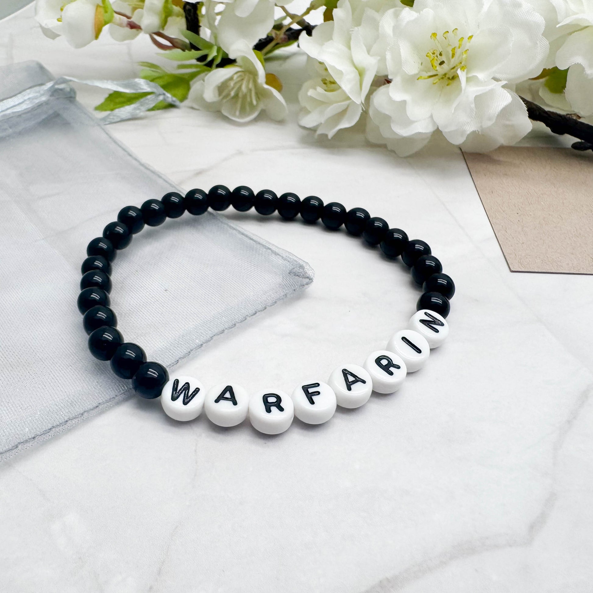 This Warfarin medical alert bracelet is made with 6mm acrylic beads and flat white acrylic letter beads measuring 7mm in diameter. The bracelet is threaded on strong elastic, allowing a small amount of stretch so it can be rolled gently onto the wrist. Lightweight, allergy-friendly, and comfortable, it is suitable for all-day wear.