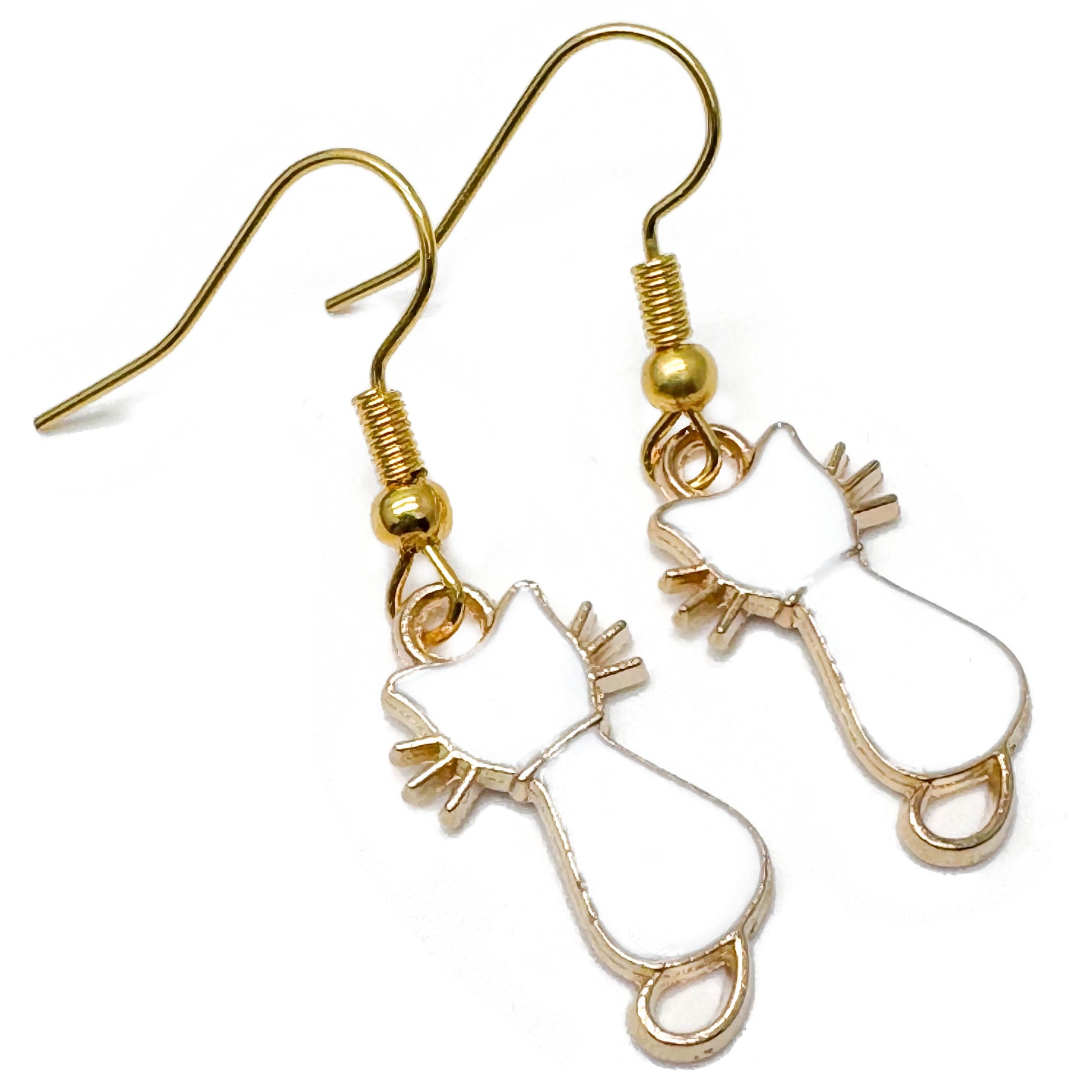 Super cute earrings featuring white enamel kitty cat charm beads, mounted on gold tone hooks.